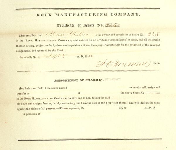 1836, New Hampshire. Stock certificate for 1 share. Black. Uncancelled. Very fine.