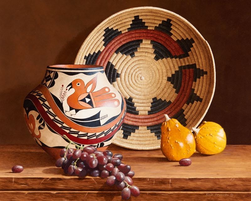 To the unaided eye, this piece appears to be in excellent condition. Inspection under ultraviolet light reveals a normal fluorescence of the artist's pigments. There are no signs of damage or restoration. The piece is framed in a pale antiqued dark wooden frame with a gold leaf inner edge. The frame is in very good condition. Plate: "Legends and Lessons", Rock Newcomb. Verso: [label affixed to backing] National Cowboy and Western Heritage Museum, Prix de West Invitational, Title: "legends and Lessons", Artist: Rock Newcomb, Size: 16" x 20", Medium: Acrylic; [handwritten on back of panel] This painting features a Navajo wedding basket, an Acoma olla, grapes and gourds. The basket design is viewed by Navajos as a map by which to chart their lives. It represents origination, birth, darkness, struggle, pain, marriage, enlightenment, the spirit world and a pathway to the light. During ceremonies the pathway line is always pointed east. The last coil on the basket rim is finished off at the pathway to allow the medicine man to easily locate it in the darkness. The modern Acoma olla features designs known as "old style" because of the macaws and rainbow. These motifs came into prominent use in the 1880s. Macaws, traded from as far as Guatamala (sic) since at least the 1100s, were desired for their colorful feathers, used for ceremonies, prayer sticks and personal adornment. The rainbow pattern is an appeal/prayer for moisture. Grapes were grown by Franciscan priests in New Mexico as early as 1598 for use in sacramental wines. The gourds are indicative of one of the many varities (sic) of crops grown by early Native Americans as well as later colonial Spaniards.; "Legends and Lessons", original acrylic painting, Rock Newcomb ©