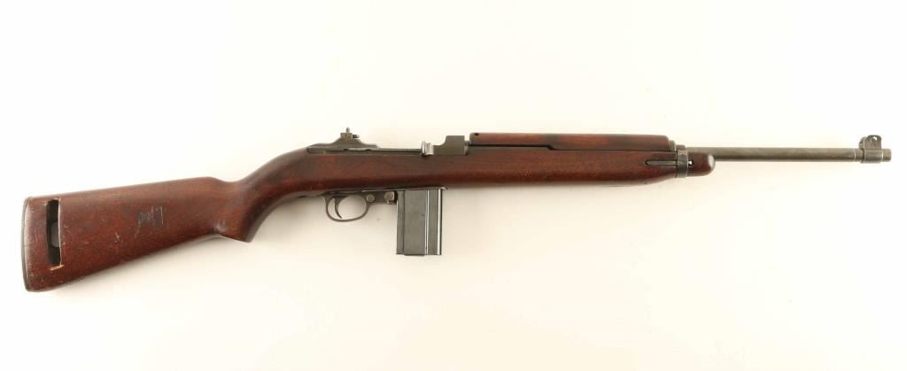 US military semiautomatic rifle with early WWII configuration. Features parkerized finish, walnut stock & handguard, protected blade front sight, peep rear sight with "L" flip apertures, 18" barrel, manual safety, front sling swivel, sling slot in butt, accepts detachable magazine. Bore is very good condition. Retains 90% finish with loss on edges, coloration appears consistent with early war guns from the factory. Early production variations include: high wood stock, 2 rivet handguard with deep sighting groove, narrow band (no bayonet lug) with flat swivel, push button safety, flipper rear sight, early mag catch. Wood is good to very good condition with dents & dings, rough gouges on right side of stock at oiler slot. Markings include "ROCK-OLA" on barrel & recoil plate, "P" on barrel, "RMC" & crossed cannons on right side of butt . No importer marks observed. Includes one blued steel magazine marked "IU". Condition is NRA Good++ *** C&R Firearm ***