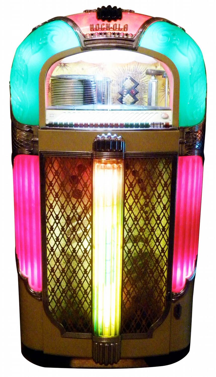 Rock-Ola Model 1428, "Magic-Glo" Juke Box, 1948. Regarded as being "Alive" and breathing "Showmanship" when first released by Rock-Ola. Plays 20, 78 RPM selections, 5/10/25 cent play. Full set of records. Complete with coin. Excellent working condition, comes with keys. 31 X 60 X 27 inches.