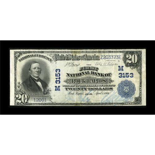<B>Rock Rapids, IA</B></I> - $20 1902 Plain Back Fr. 650 <B>The First NB</B></I> Ch. # (M)3153<BR> This Lyon County example carries a neat layout. Plenty of crispness remains and the colors are bright, though the signatures have faded a bit. <B>Very Fine</B></I>.<BR><BR><b>Shipping:</b> Coins & Currency (<a target="_blank" href="http://www.heritageauctions.com/common/shipping.php">view shipping information</a>)