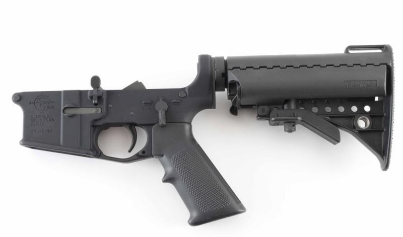 SN: CM136026 Lower receiver assembly accepts AR15 type uppers. Includes all internal parts. Features matte black color on all parts, A2 style pistol grip, VLTOR collapsing stock with storage compartments, socket for QD swivel on butt. Shows few minor scuffs to parkerized finish, some bare metal where roll pin at rear of trigger guard was installed. Condition is NRA Very Good++ *** Modern Firearm ***