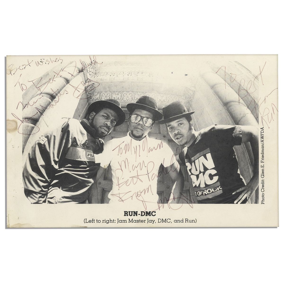 Photo of Run-DMC signed. Run-DMC is the first hip-hop group to be inducted into the Rock and Roll Hall of Fame. Black and white photograph of the trio is signed by all three, with autograph inscriptions reading, ''Best wishes / to / Bert Padell / from / Jam Master Jay'', ''To my main / man / Bert Padell / From / DMC'', and ''To / Bert / From / Run''. Publicity photo credited to Glen E. Friedman/AWFDA features a semi-matte finish. Measures 8.5'' x 5.5''. Adhesive residue to verso and some toning, else near fine.