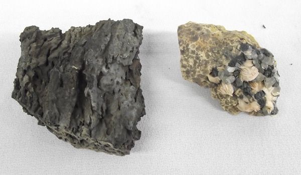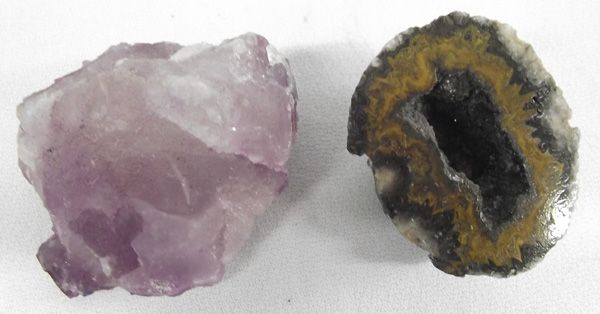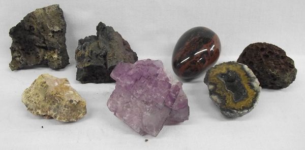 Rock Specimens, collection includes the following: amethyst quartz, 3 pieces lava (pumice), cut geode, brown/black obsidian egg, and quartz rock with clear-pink-black crystals, largest measures 2''H x 3''W
