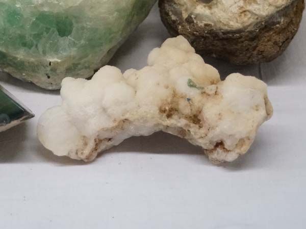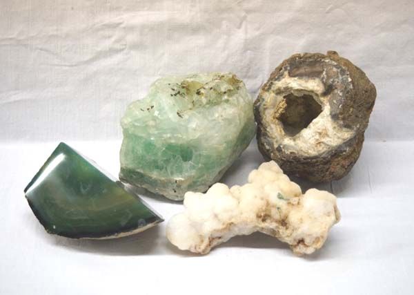 Rock Specimens, largest measures 4'' x 4'' x 4'', includes large fluorite, cut agate geode, white crystal geode, and calcite