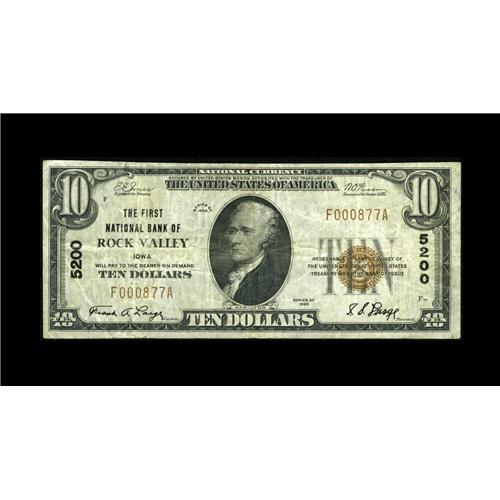 <B>Rock Valley, IA</B></I> - $10 1929 Ty. 1 <B>The First NB</B></I> Ch. # 5200<BR>A <B>Very Fine</B></I> note from the only issuer in this Sioux County community. Although 941 sheets of this denomination were issued, just six are recorded in the census, with this being the highest serial yet traced.