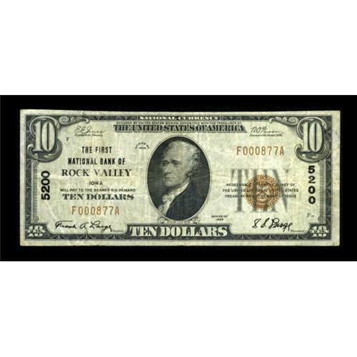 <B>Rock Valley, IA</B></I> - $10 1929 Ty. 1 <B>The First NB</B></I> Ch. # 5200<BR> A <B>Very Fine</B></I> note from the only issuer in this Sioux County community. Although 941 sheets of this denomination were issued, only about a dozen are recorded in the census.<BR><BR><b>Shipping:</b> Coins & Currency (<a target="_blank" href="http://www.heritageauctions.com/common/shipping.php">view shipping information</a>)