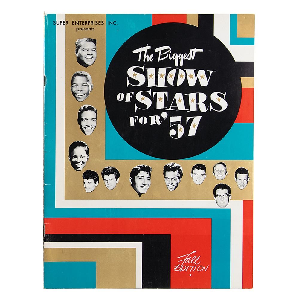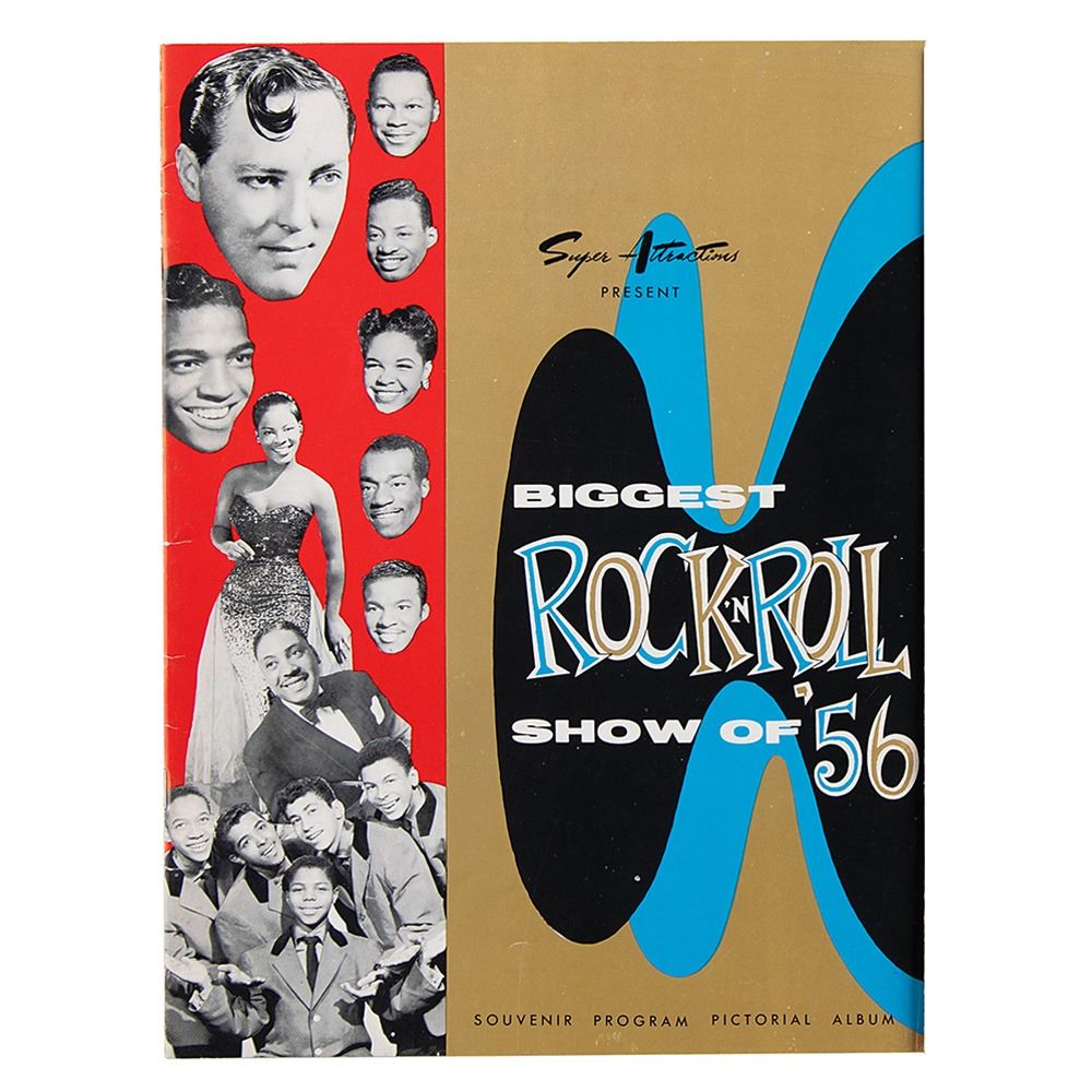 Two original vintage rock 'n' roll souvenir programs, both 9 x 12, featuring numerous images of early rockers inside. Includes: one for the "Biggest Rock 'n' Roll Show of '56," featuring Bill Haley, Clyde McPhatter, The Platters, LaVern Baker, Joe Turner, Frankie Lymon and The Teenagers, and The Drifters; and one for "The Biggest Show of Stars for '57," featuring Fats Domino, Clyde McPhatter, LaVern Baker, Frankie Lymon, Chuck Berry, Buddy Holly and The Crickets, Frankie Lymon, The Everly Brothers, and The Drifters. In overall fine condition.