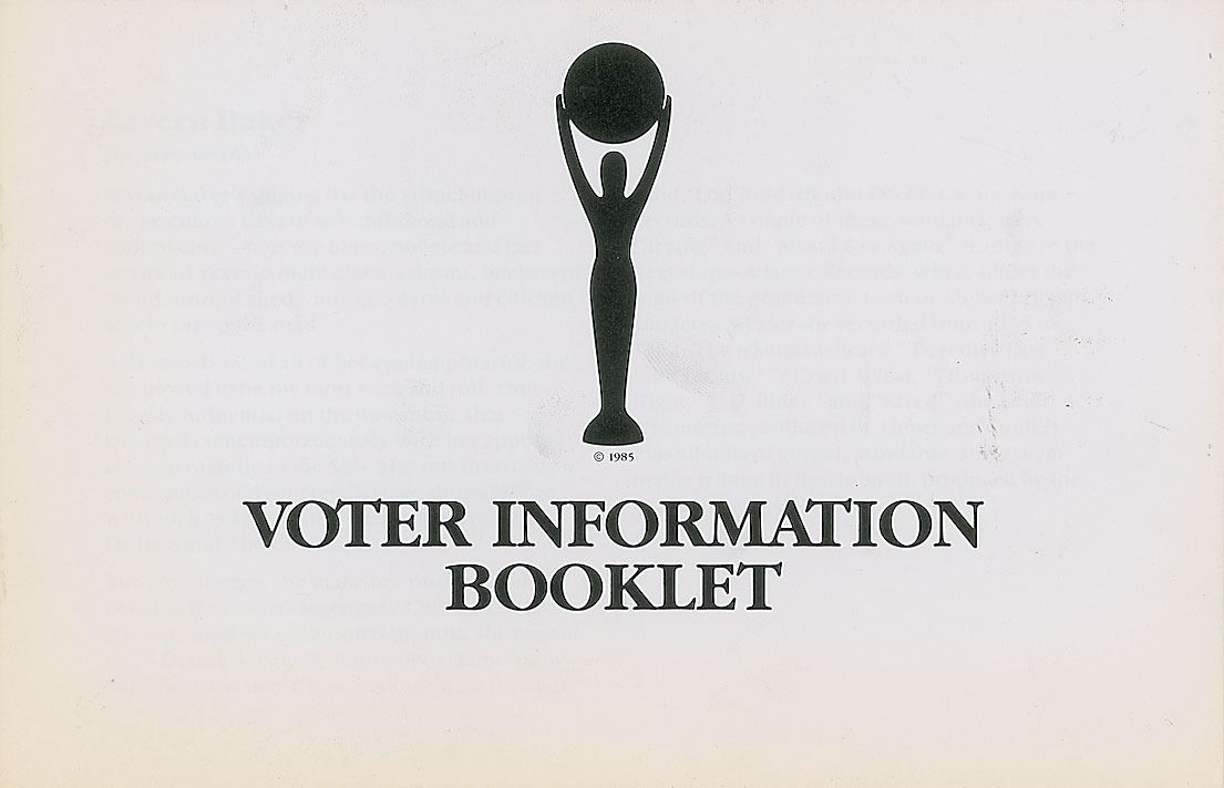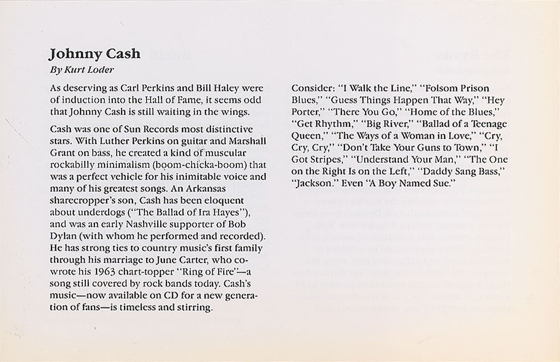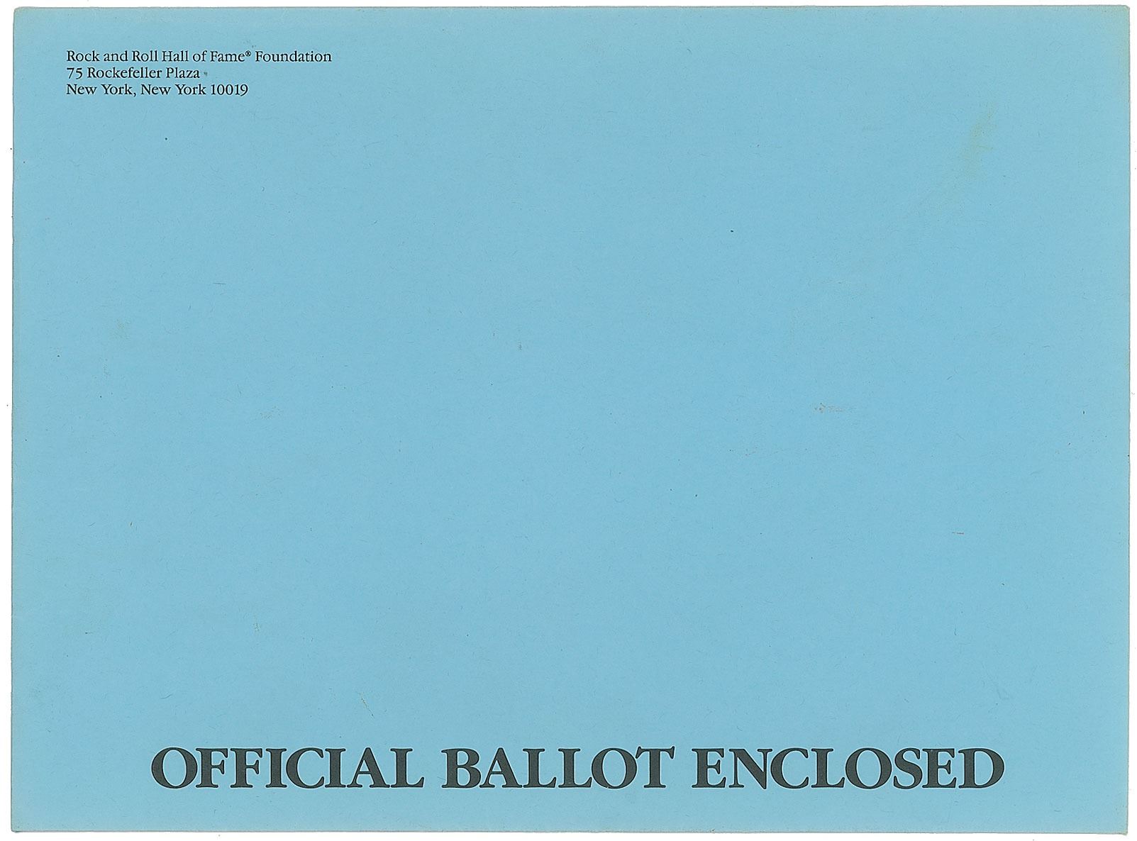 Original "Voter Information Booklet" for the 1991 Rock and Roll Hall of Fame voting, 8.5 x 5.5, featuring biographies of the candidates: LaVern Baker, Bobby 'Blue' Bland, The Byrds, Johnny Cash, Duane Eddy, John Lee Hooker, The Impressions, Elmore James, Frankie Lymon and the Teenagers, The Moonglows, Wilson Pickett, Jimmy Reed, Ike and Tina Turner, Gene Vincent, and The Yardbirds. Includes a larger blue envelope, noting, "Official Ballot Enclosed" [ballot no longer present]. In fine condition.