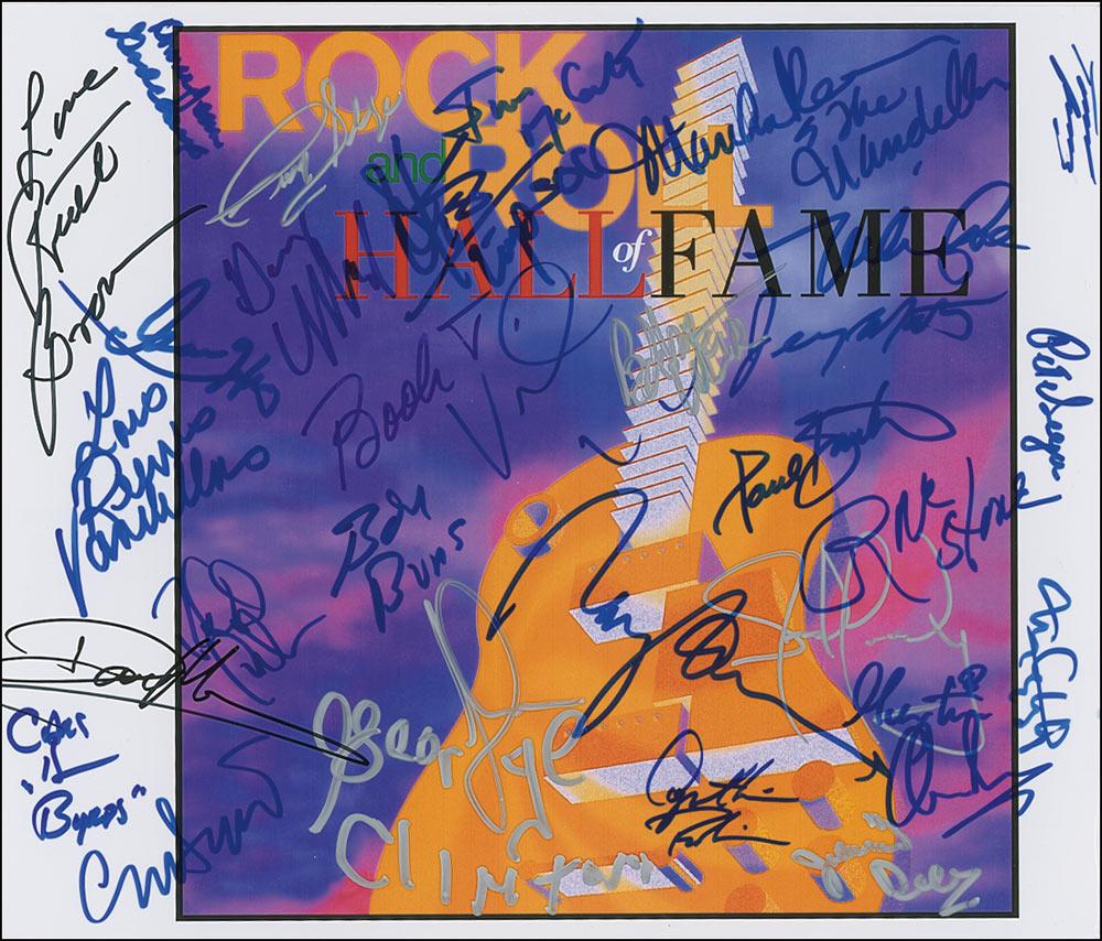 Color glossy 11 x 13 Rock and Roll Hall of Fame art photo, signed in ink and felt tip by 31 members and rock legends. Signers are: George Clinton of Parliament Funkadelic, Ruth Brown, Ray Davies of the Kinks, Pete Seeger, Percy Sledge, Grateful Dead including Bob Weir, Donna Jean Godchaux and Tom Constanten, Mike Love of the Beach Boys, Earth, Wind and Fire including Ralph Johnson and Verdine White, Isaac Hayes, Martha Reeves and the Vandellas including Martha Reeves and Lois Reeves, Jefferson Airplane including Jorma Kaukonen, Jack Casady and Paul Kantner, Booker T. Jones of Booker T and the MG's, Doug Cosmo Clifford of Creedence Clearwater Revival, Otis Williams of The Temptations, Dave Mason of Traffic, Bob Burns of Lynyrd Skynyrd, Chris Hillman of the Byrds, The Yardbirds including Chris Dreja and Jim McCarty, Tommy Ramone of The Ramones, Sly and the Family Stone including Jerry Martini, Cynthia Robinson and Rose Stone, Martin Chambers of the Pretenders and Johnnie Carter of The Dells. In fine condition.