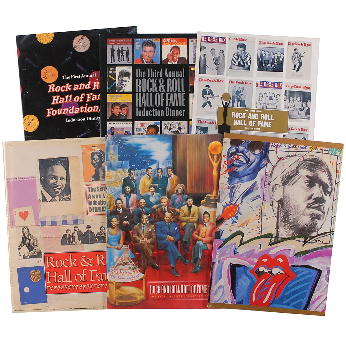 Collection of six unsigned programs from the first six induction ceremonies to the Rock and Roll Hall of Fame, all approximately 8.5 x 12. Among the inductees are: Elvis Presley, James Brown, Marvin Gaye, Roy Orbison, The Beach Boys, Bob Dylan, The Rolling Stones, and The Who. In overall fine condition.