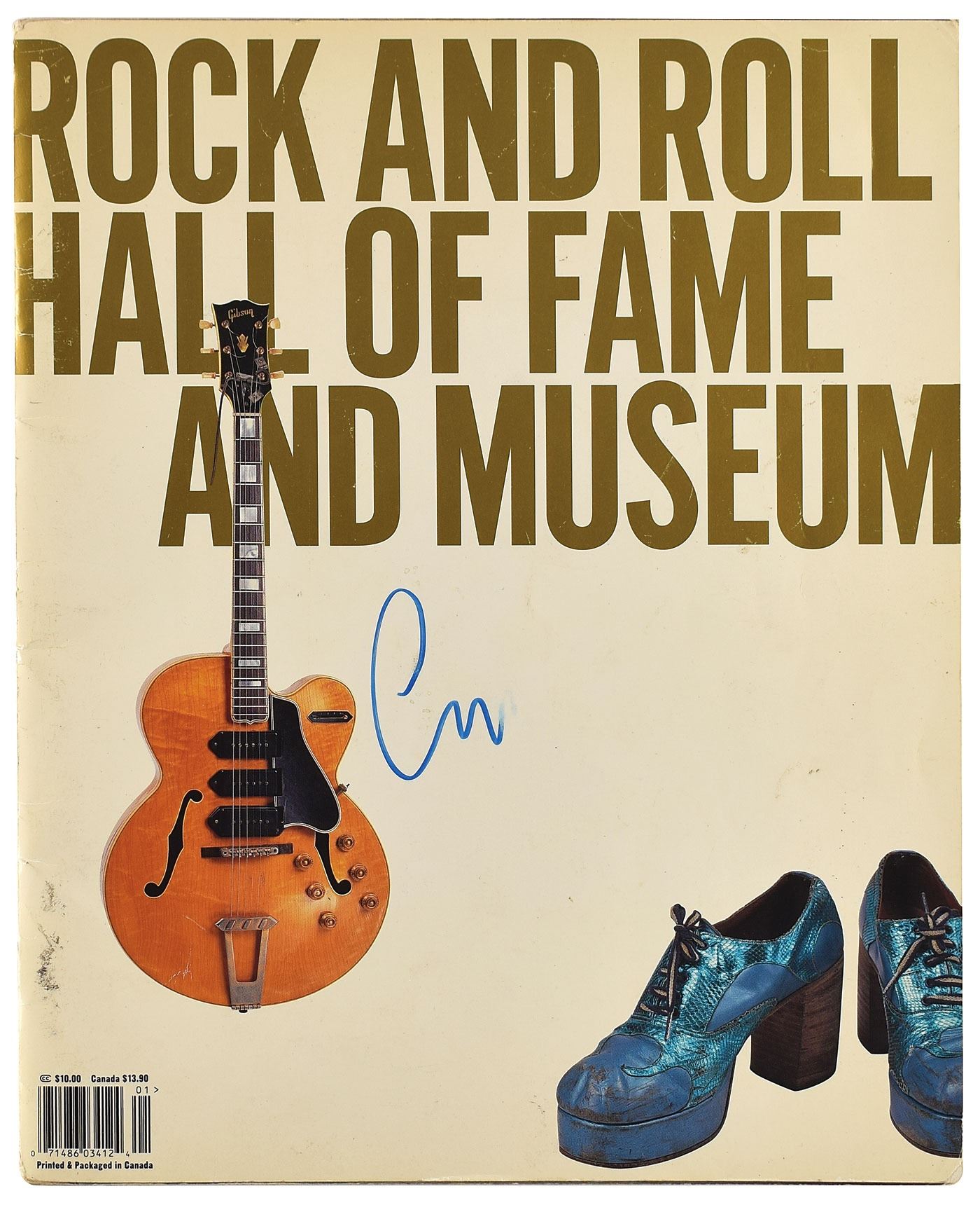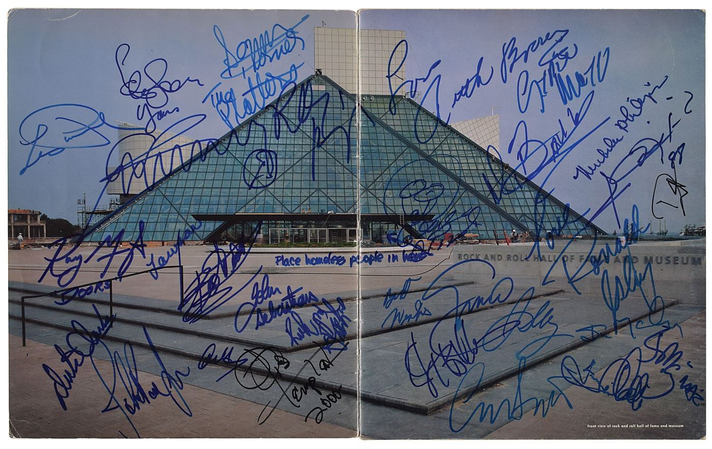 Original program for the 1995 Rock and Roll Hall of Fame induction ceremony, 62 pages, 11 x 13.5, signed on the opening museum image in blue or black felt tip by numerous musicians and inductees, including: John Paul Jones, Les Paul, Bo Diddley, Robby Krieger and Ray Manzarek of The Doors, Dick Clark (emcee), Frankie Valli, Al Green, John Sebastian, Otis Williams, George Clinton, Chris Dreja and Jim McCarty of The Yardbirds, Ronald Isley, Michelle Phillips, Ruth Brown, Eric Burdon, Peter Green, and more. In fine condition, with light handling wear. Accompanied by the original souvenir program for the grand opening of the Rock and Roll Hall of Fame on Labor Day 1995.