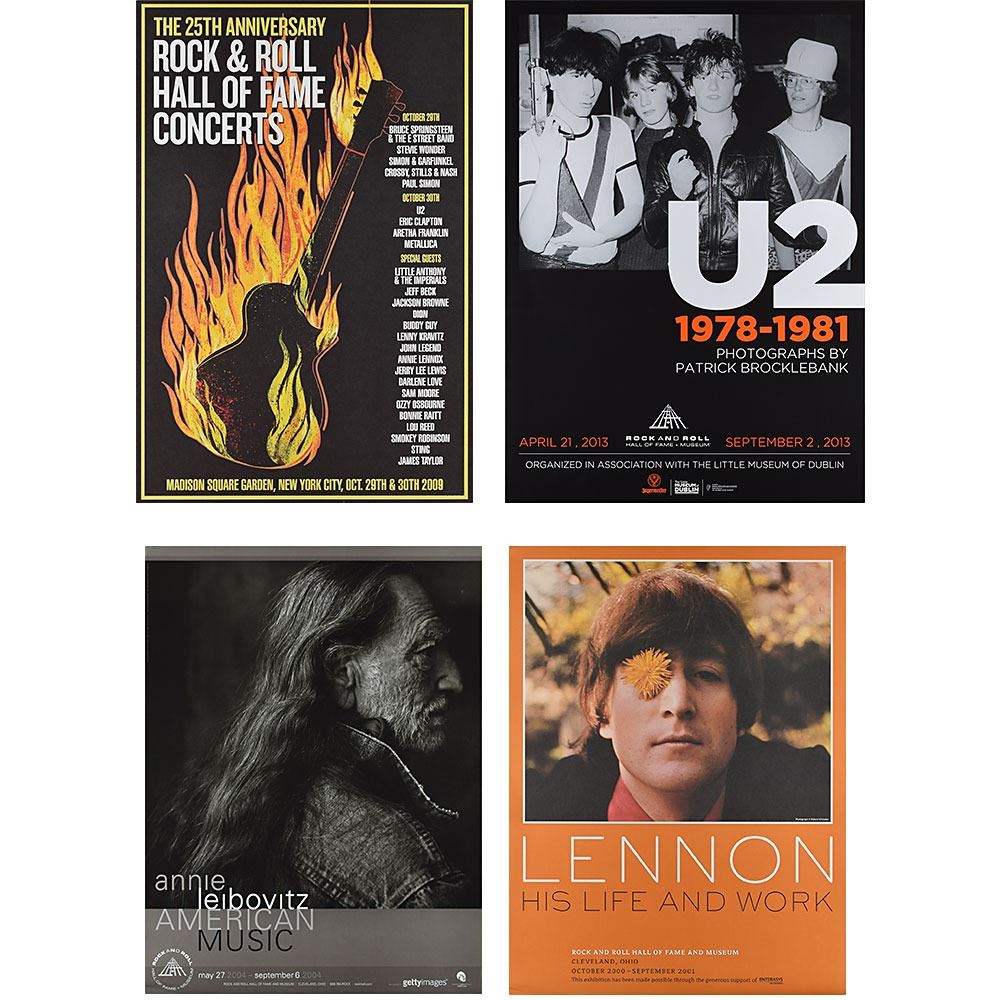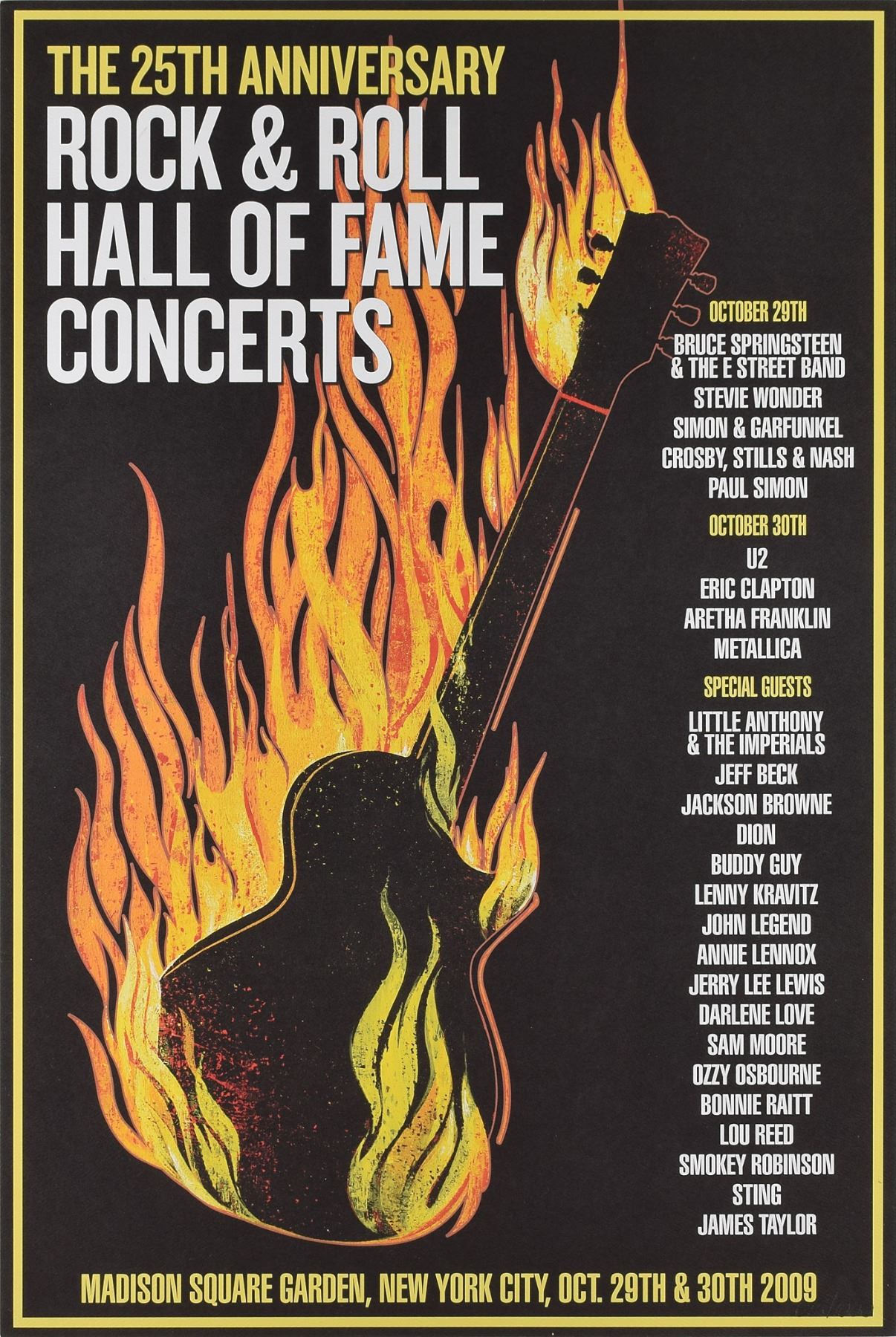 Limited edition color 16 x 23.75 print for "The 25th Anniversary Rock & Roll Hall of Fame Concerts" held at Madison Square Garden on October 29 and 30, 2009, hand-numbered 675/1000, showing a large flaming guitar and listing the 27 acts scheduled to perform, including: Bruce Springsteen and the E Street Band, U2, Eric Clapton, Stevie Wonder, Metallica, Aretha Franklin, Lou Reed, Buddy Guy, Jeff Beck, and many more. These concerts are considered by many to be among the greatest ever. In fine condition.