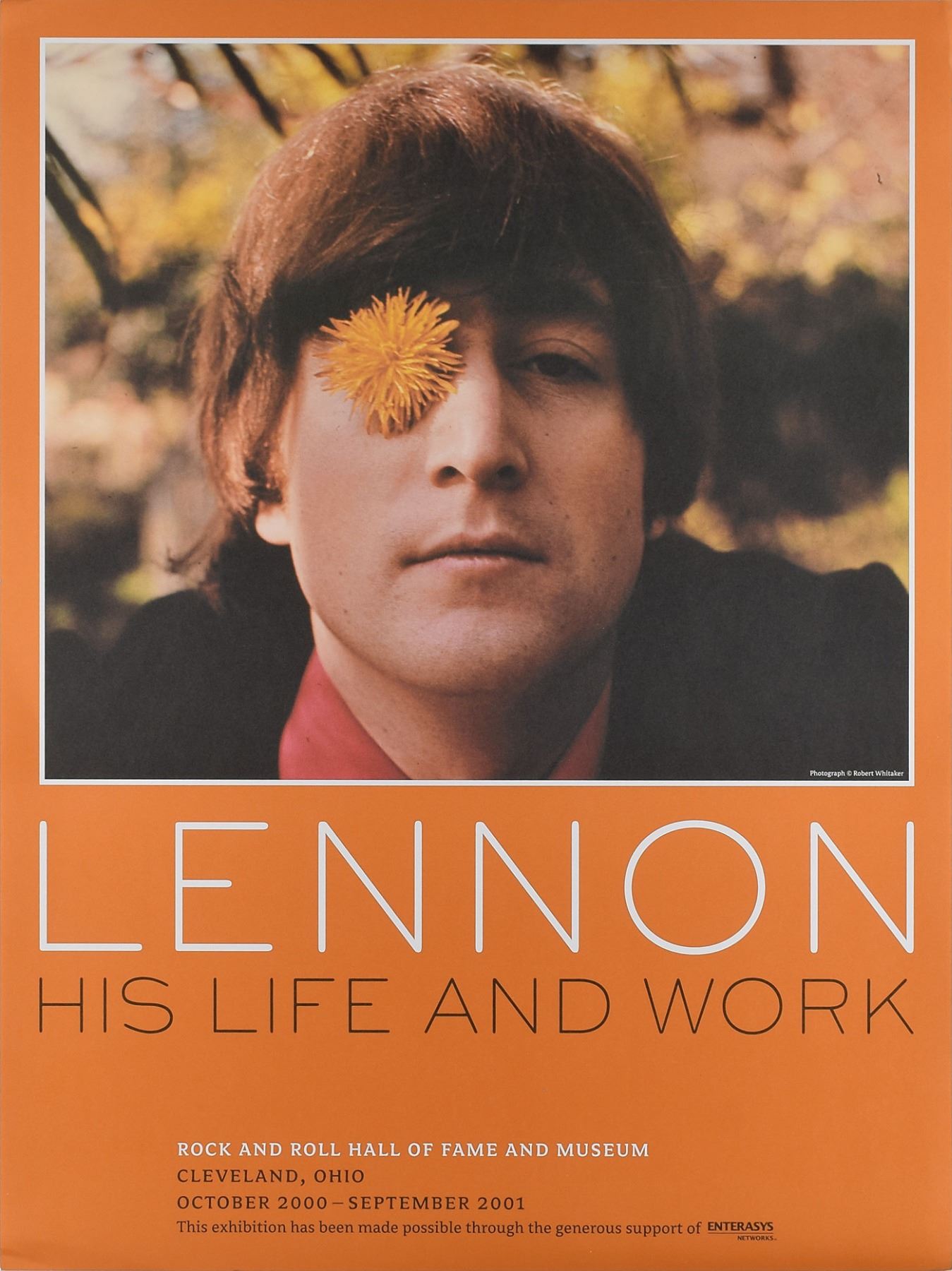Sought-after original 18 x 24 poster for the "Lennon His Life and Work" exhibit at the Rock and Roll Hall of Fame Museum in Cleveland, Ohio, held from October 2000 to September 2001, showing John Lennon with a dandelion in his eye, fondly known as 'Adoration' by photographer Robert Whitaker. In fine condition, with light corner creasing.