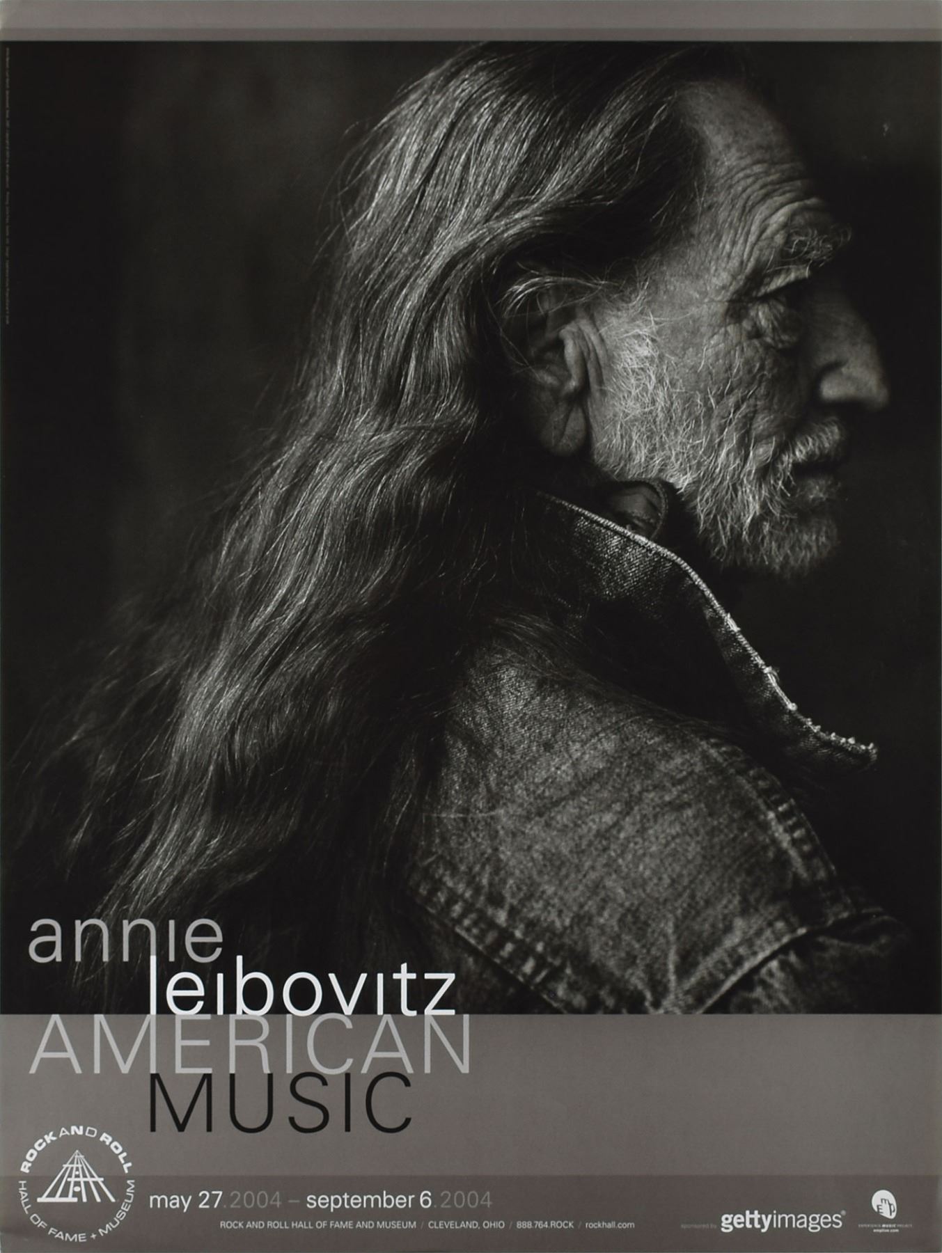 Original 18 x 24 poster for the exhibition 'Annie Leibovitz: American Music,' depicting her portrait of Willie Nelson, held at the Rock and Roll Hall of Fame and Museum in Cleveland, Ohio, from May 27 to September 6, 2004. In fine condition, with a slight crease to the lower left corner.