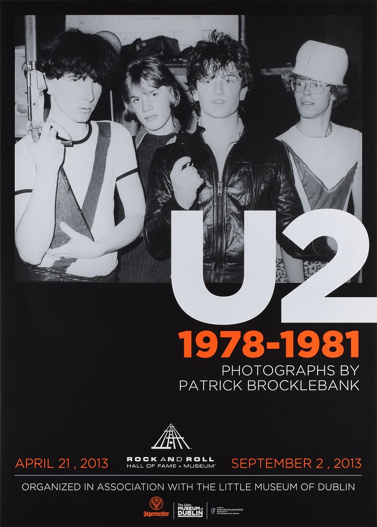 Original color 19.75 x 20.5 poster for the exhibition 'U2: 1978–1981, Photographs by Patrick Brocklebank,' held at the Rock and Roll Hall of Fame and Museum in Cleveland, Ohio, from April 21 to September 2, 2013. In fine condition.