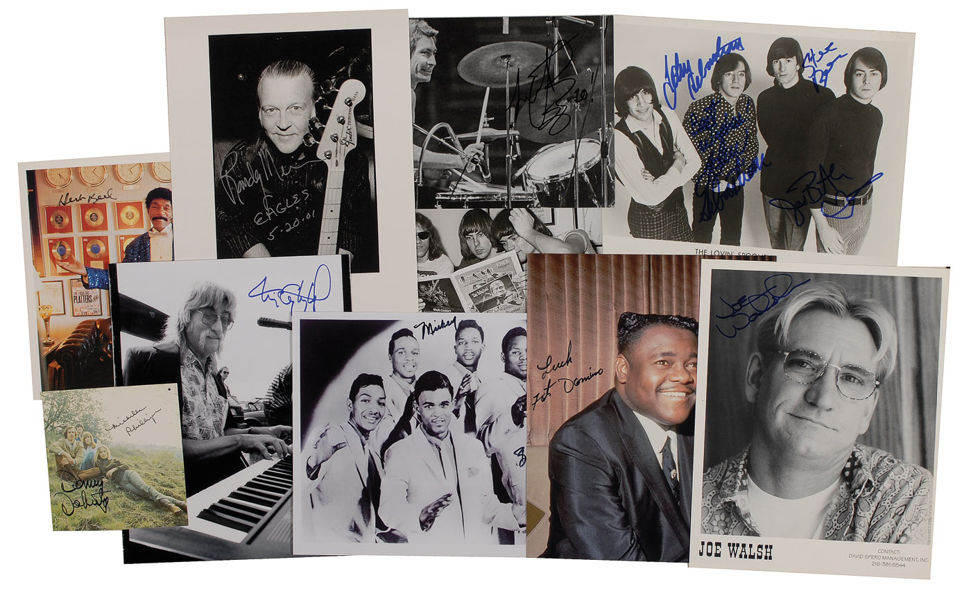 Ten signed photos of various finishes and sizes, each signed in ink and felt tip by the respective musician or musicians pictured. Signers are: Charlie Watts, Michelle Phillips and Denny Doherty, Randy Meisner, Tommy Ramone, Tom Constanten, Mickey [McGill], Fats Domino, Herb Reed, Joe Walsh, and John Sebastian (signed twice), Steve Boone, and Joe Butler. In overall fine condition, with light surface creasing to the Lovin’ Spoonful photo and a small pin hole to the top right corner of The Mamas & The Papas clipped photo.