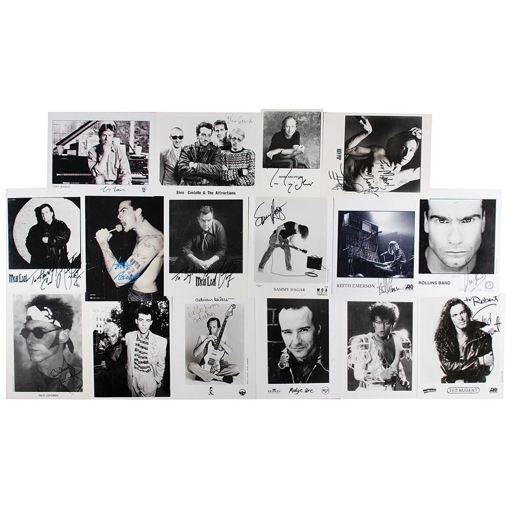 Collection of 16 photos individually signed by a noted rock musician or frontman, ranging in size from 5.75 x 8.25 to 8.5 x 11, with some inscribed. Subjects include: Tony Banks, Adrian Belew, Elvis Costello, Keith Emerson, Bob Geldof (and Paula Yates), Gary Glitter, Sammy Hagar, Mark Knopfler, Nils Lofgren, Meat Loaf (2), Ted Nugent, Iggy Pop, Henry Rollins (2), and Midge Ure. In overall fine condition, with some creasing to the Nugent photo.