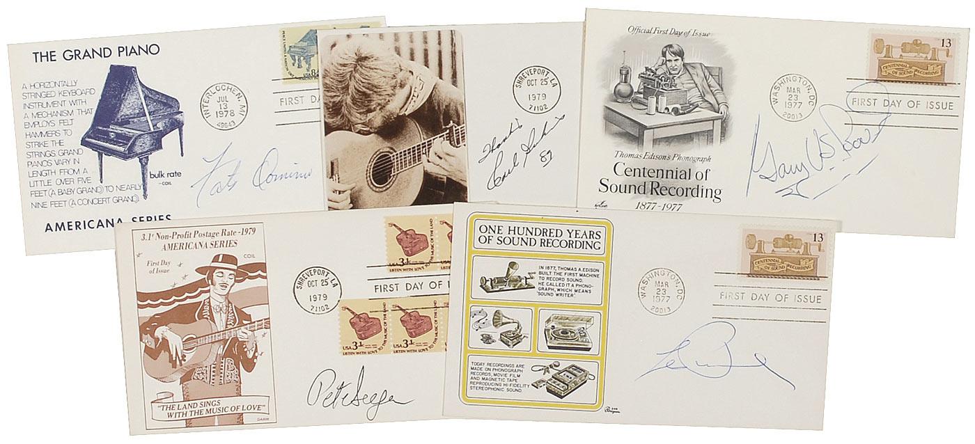 Five different FDCs, each signed on the front in ink by a different rock and roll originator. Signers are: Carl Perkins, Les Paul, Fats Domino, Gary ‘US’ Bonds, and Pete Seeger. In fine condition.