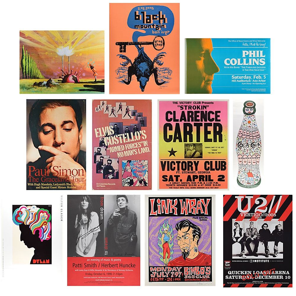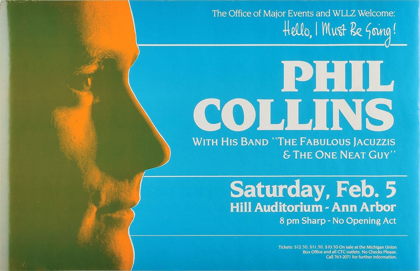 Original color 17 x 11 poster for a Phil Collins concert at the Hill Auditorium in Ann Arbor, Michigan, on February 5, 1983, during his "Hello I Must Be Going" tour, his first as a solo performer. The poster shows Collins in close-up profile against a blue background, listing his band as "The Fabulous Jacuzzis & The One Neat Guy." In fine condition.