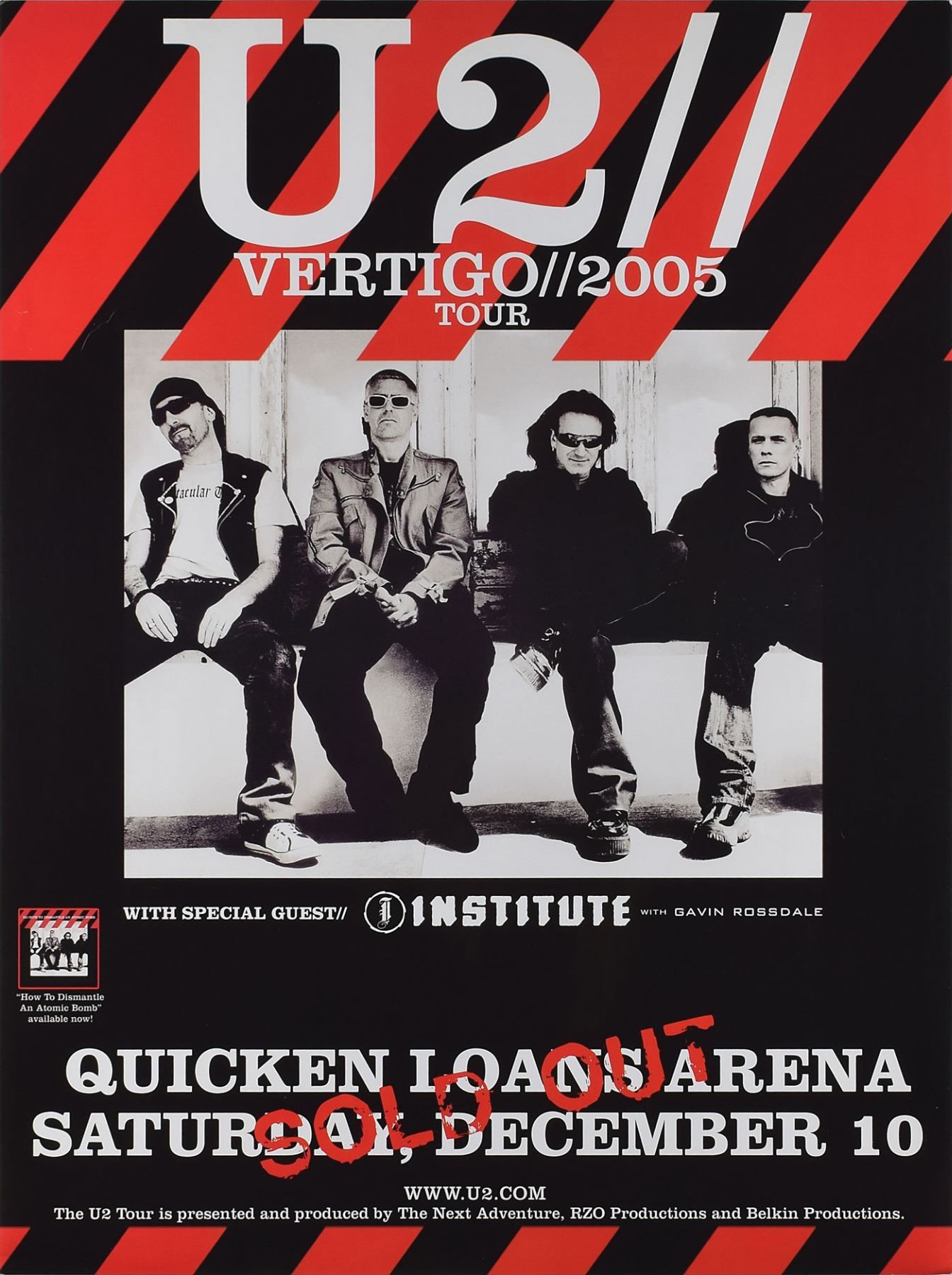 Original color 18 x 24 poster for a 'sold out' U2 concert at the Quicken Loans Arena in Cleveland, Ohio, on December 10, 2005, as part of the Vertigo Tour, showing the band as their pictured on the front cover of their album 'How to Dismantle an Atomic Bomb,' and listing the special guest as Institute with Gavin Rossdale. In fine condition.
