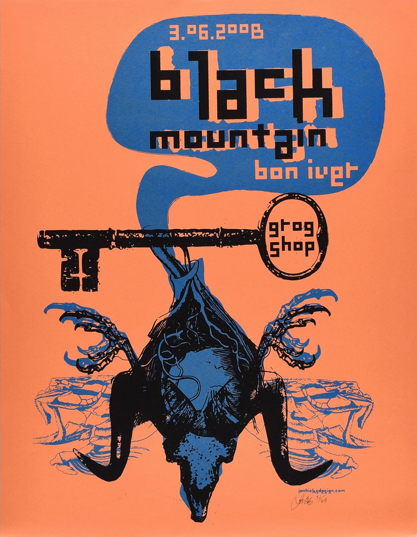 Limited edition color 17 x 22 artist print for a Bon Iver and Black Mountain concert at the Grog Shop in Cleveland Heights, Ohio, on March 6, 2008, numbered 31/65, signed in the lower right by the artist, Jon Hicks. In fine condition. Bon Iver was touring in support of their classic debut record For Emma, Forever Ago.