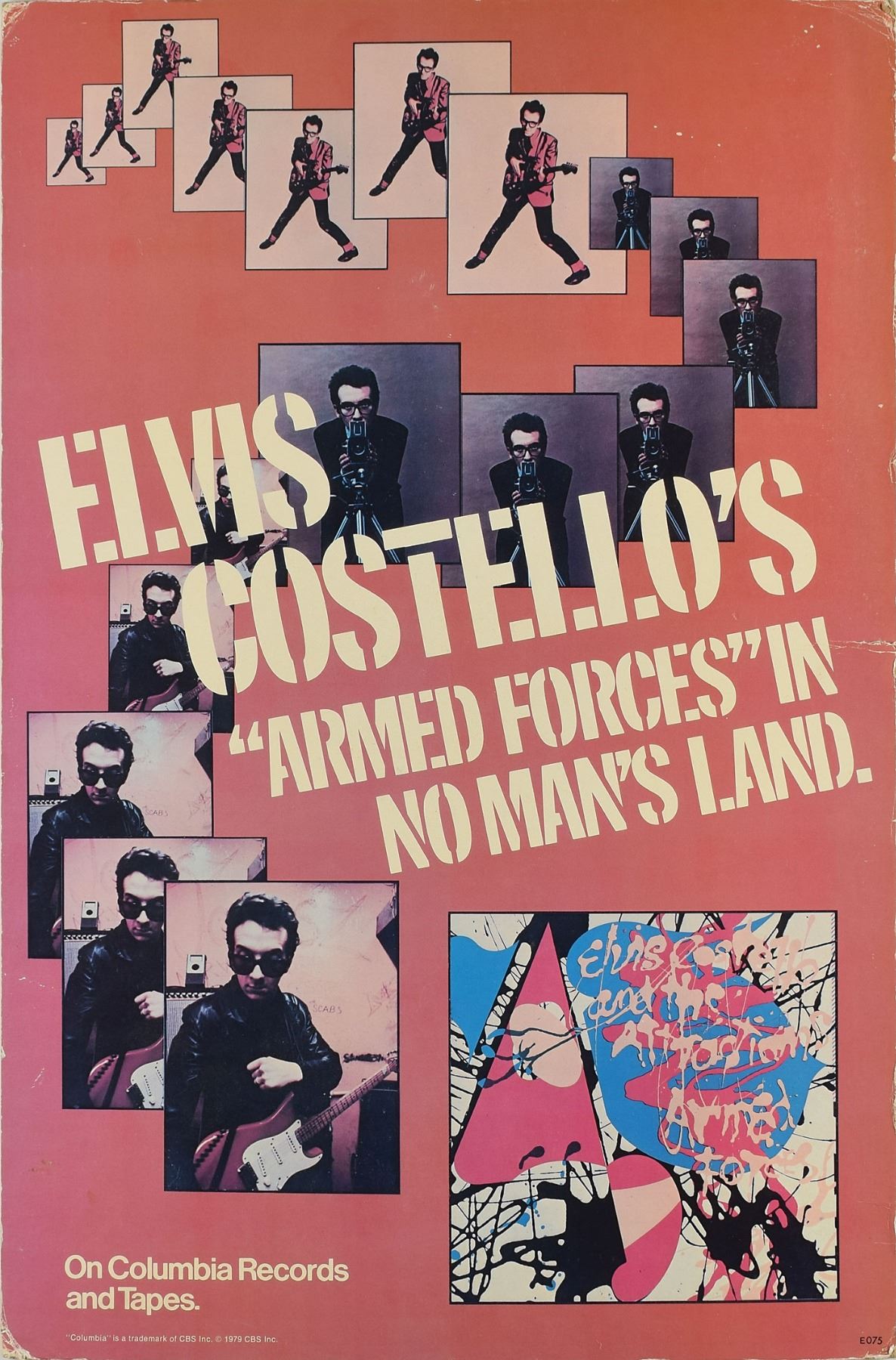 Original 1979 Columbia Records point-of-sale standee advertising the album release of 'Armed Forces' by Elvis Costello and the Attractions on record and tape, 14 x 21.25, which features several images of Costello and large stencil text: "Elvis Costello's 'Armed Forces' in No Man's Land." In fine condition, with small corner creases, and a short tear to right edge.