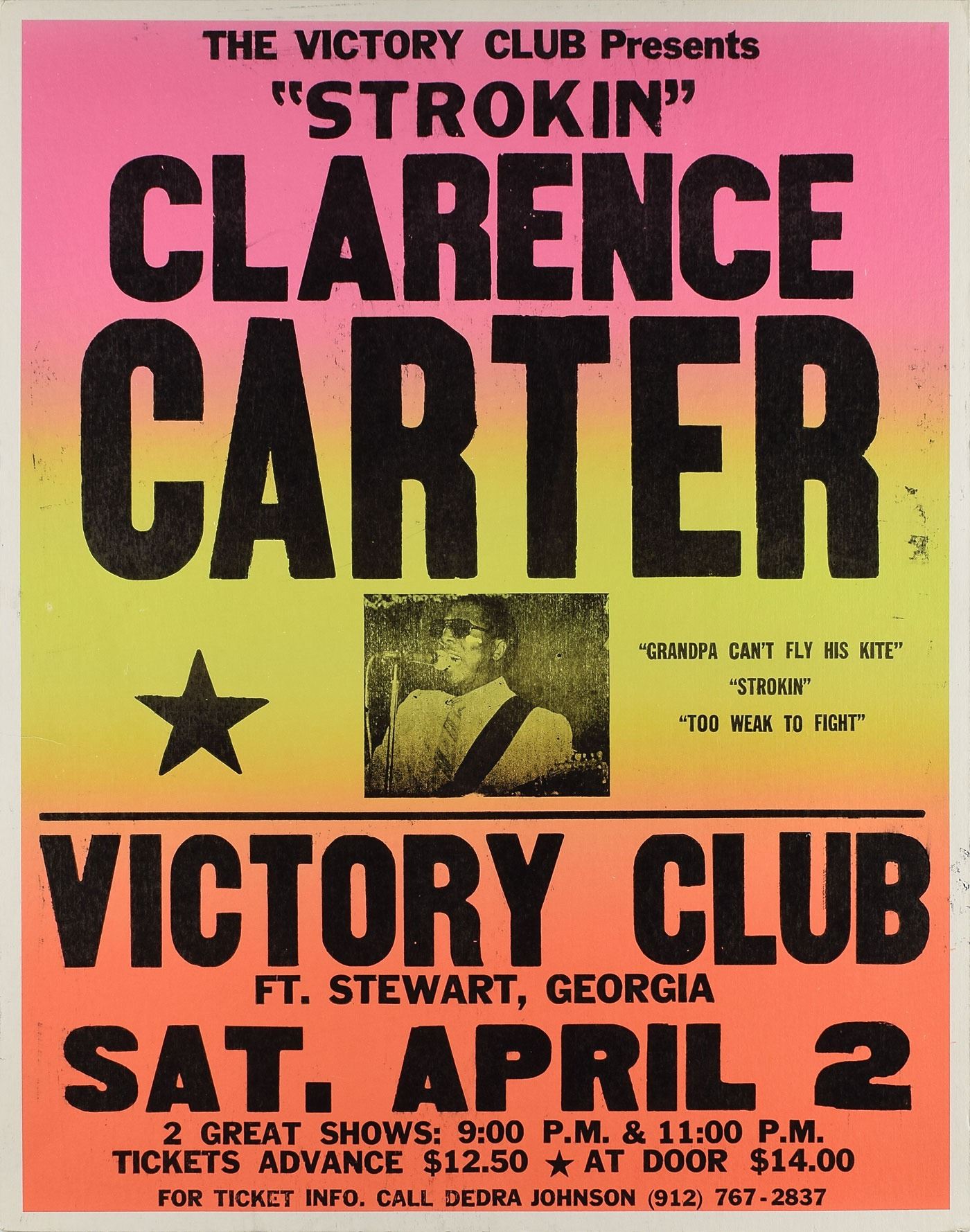 Original color 22 x 28 cardboard boxing-style poster advertising a Clarence Carter concert at the Victory Club in Fort Stewart, Georgia, on April 2nd, which lists hit singles like 'Strokin,' 'Grandpa Can't Fly His Kite,' and 'Too Weak to Fight.' In fine condition.