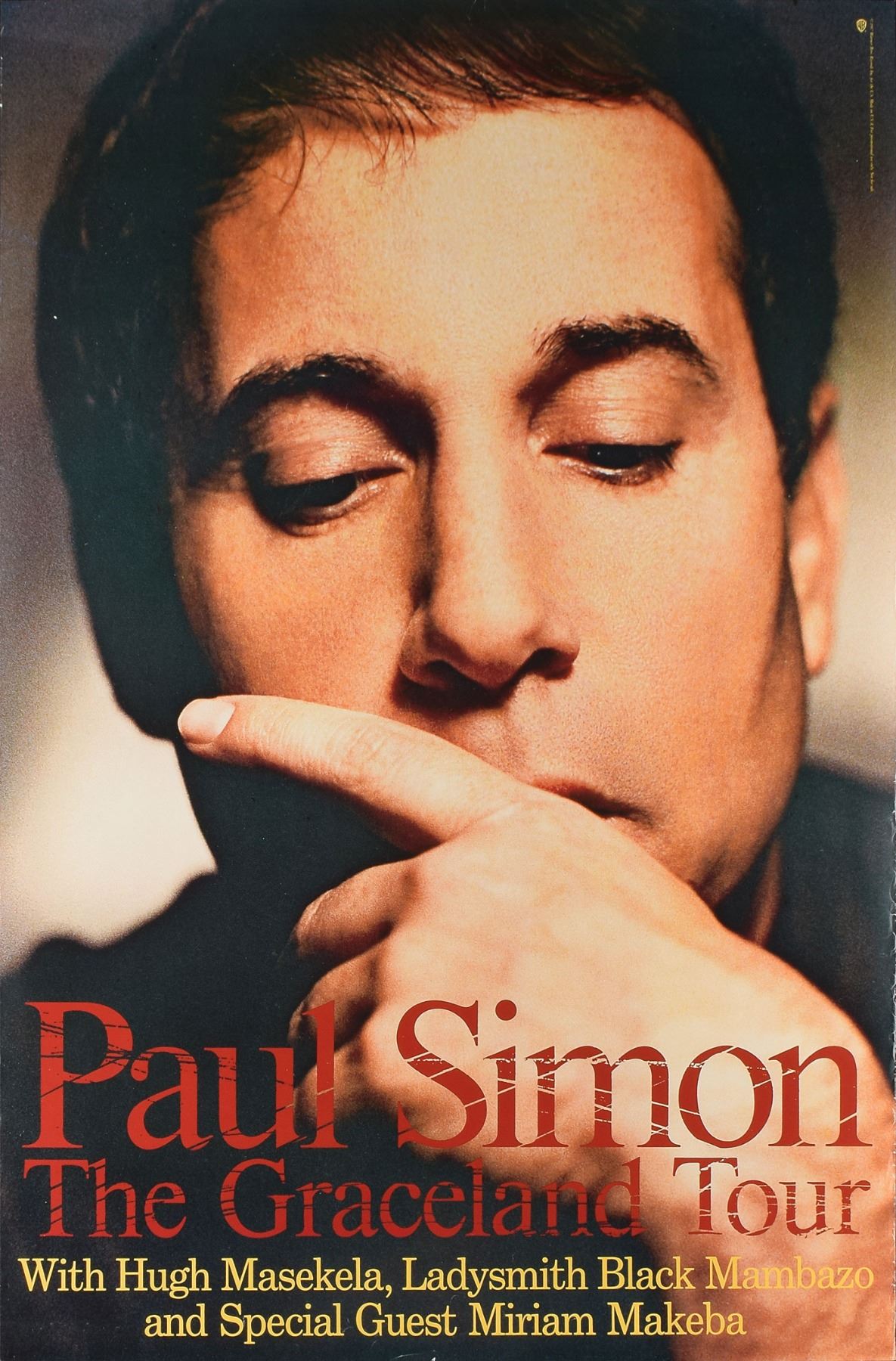 Uncommon original 1987 Warner Brothers Records poster promoting Paul Simon's 'The Graceland Tour,' 23 x 35, which depicts Simon in a thoughtful close-up pose and lists South African musicians Hugh Masekela, Ladysmith Black Mambazo, and Miriam Makeba. In fine condition, with a light bend across the bottom.