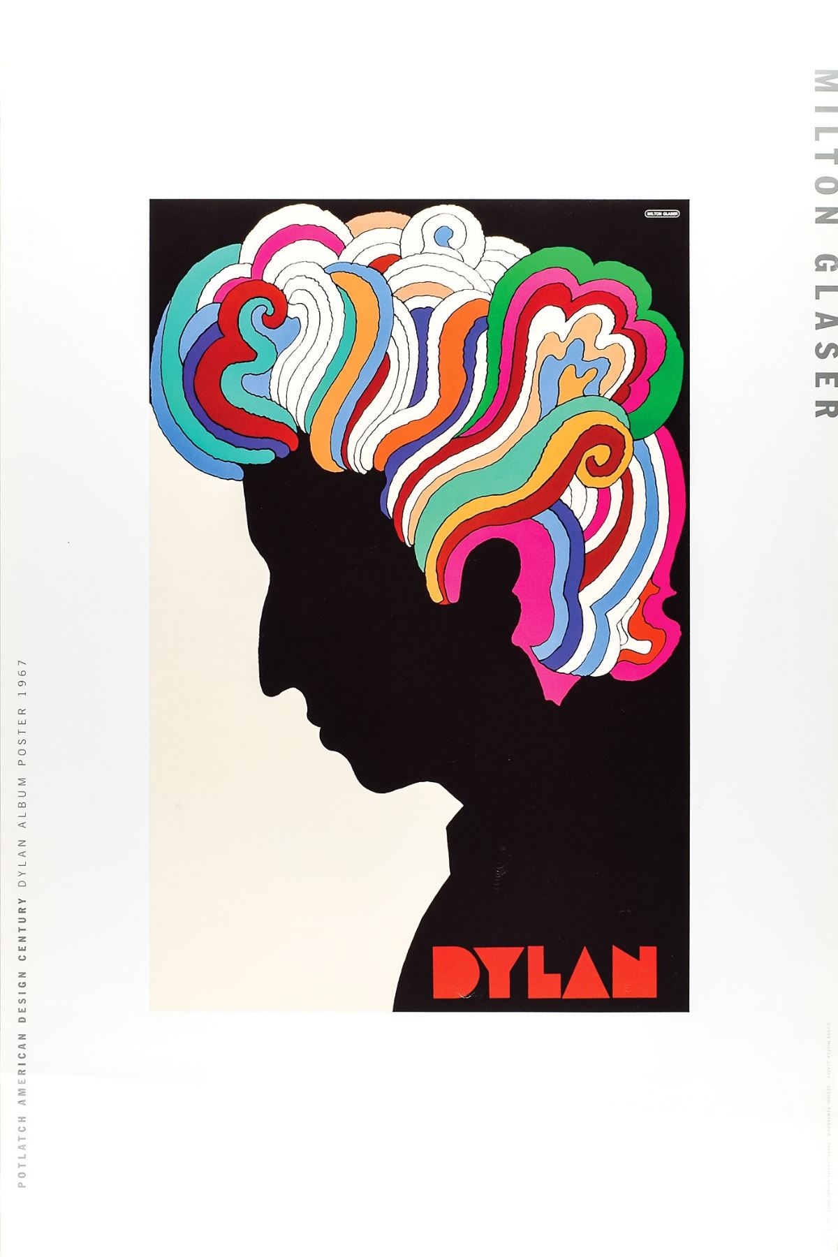 Color 24 x 36 poster commemorating Milton Glaser's 1967 poster of Bob Dylan in silhouette profile with kaleidoscope hair, issued by the Potlatch American Design Century in 1999. In very good to fine condition, with creasing to the wide borders.