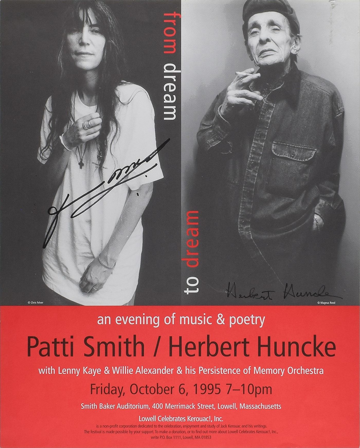 Color 16 x 20 poster for an event entitled "From Dream to Dream: An Evening of Poetry," held at the Smith Baker Auditorium in Lowell, Massachusetts, on October 6, 1995, which depicts images of Patti Smith and Herbert Huncke, both of whom have signed the poster in black felt tip. In fine condition.