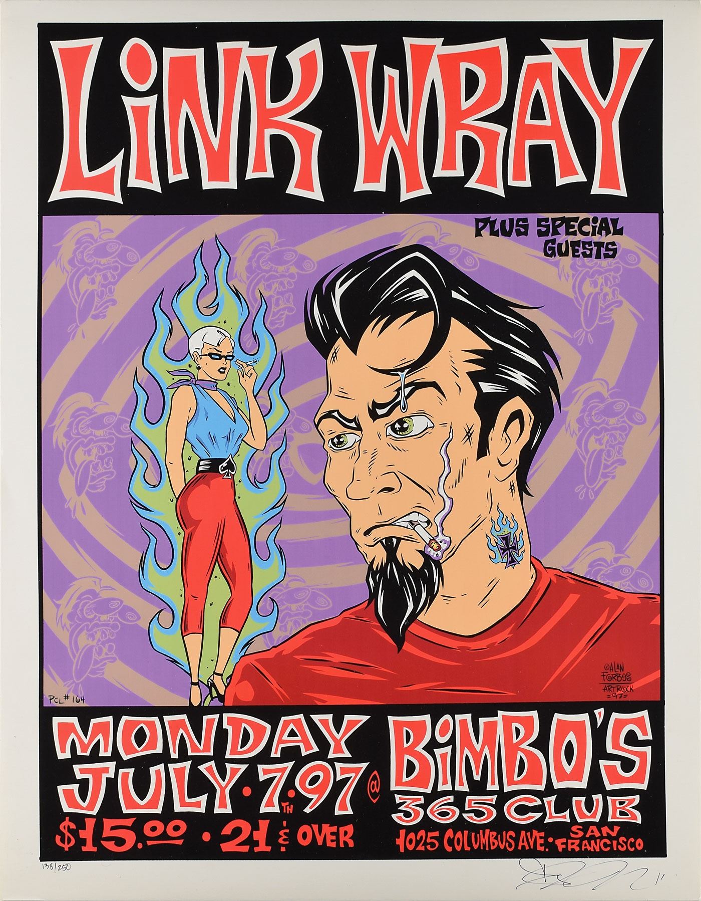 Limited edition color 18 x 23 print for a Link Wray concert at Bimbo's 365 Club in San Francisco on July 7, 1997, featuring vibrant stylized artwork by Alan Forbes, numbered 138/250, signed in the lower border in black felt tip by Forbes. In fine condition.