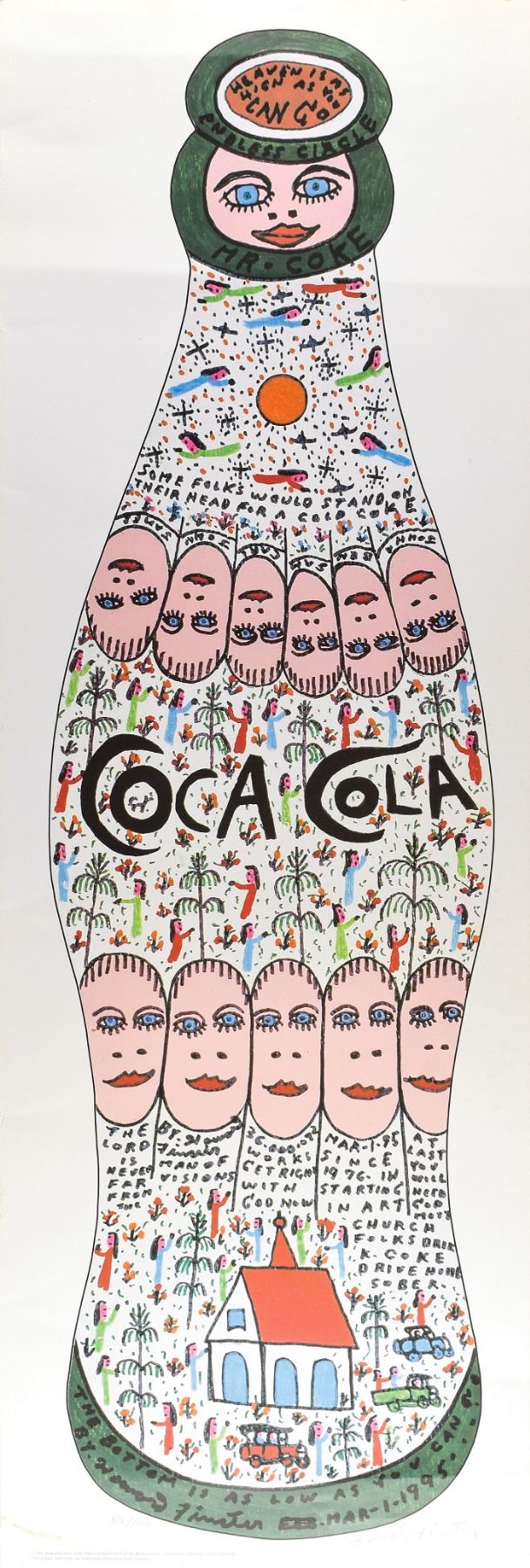 Limited edition color 13.25 x 39 print of a stylized 'Coca Cola' bottle by Howard Finster, a visionary folk artist who designed album covers for R.E.M. and Talking Heads, numbered 85/1000, signed below in pencil by Finster. In very good to fine condition, with creasing to the top.