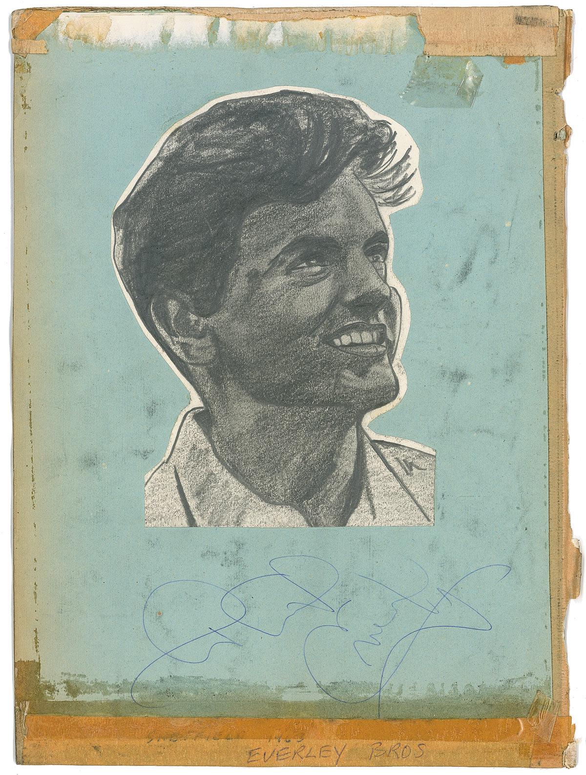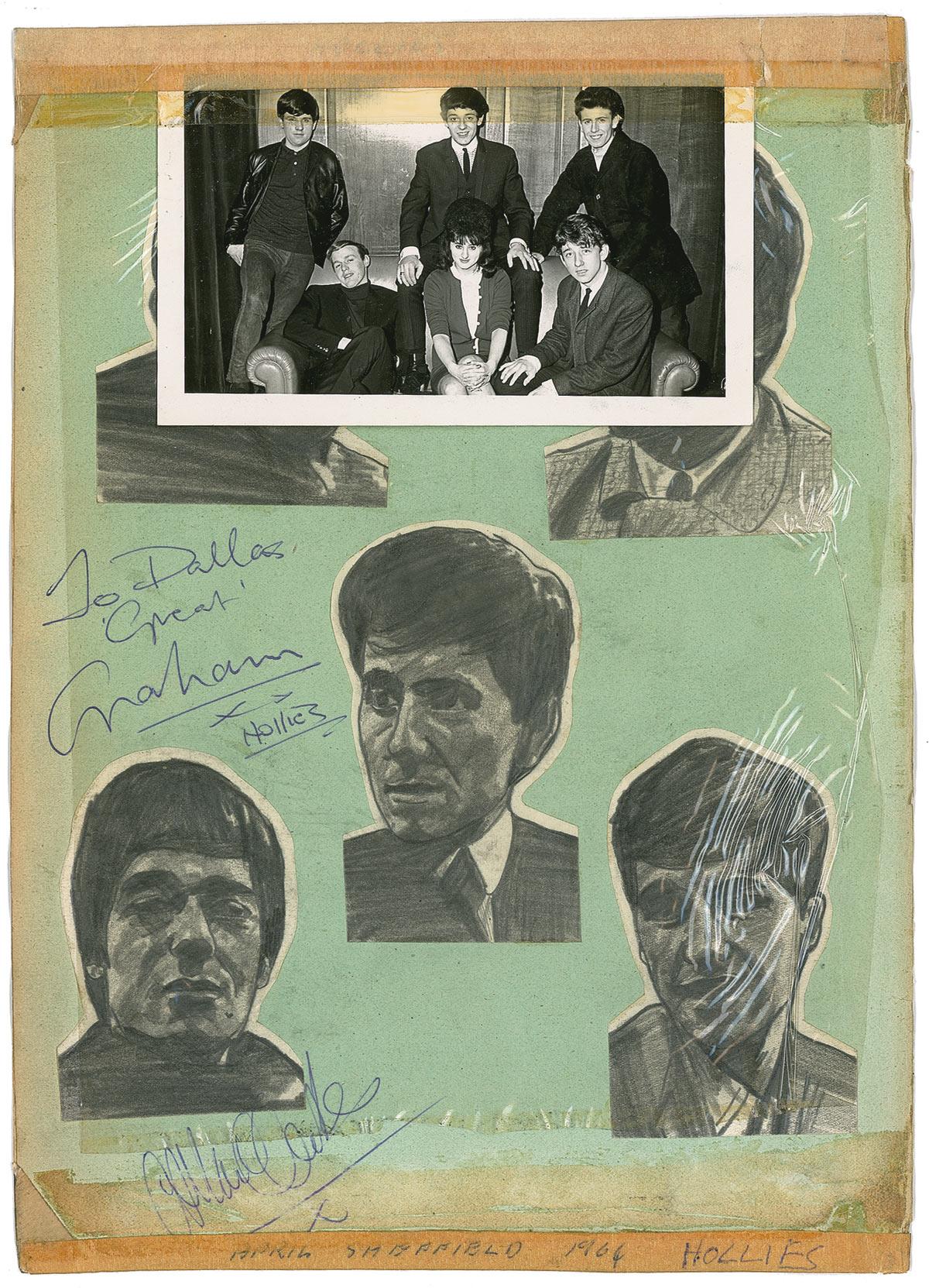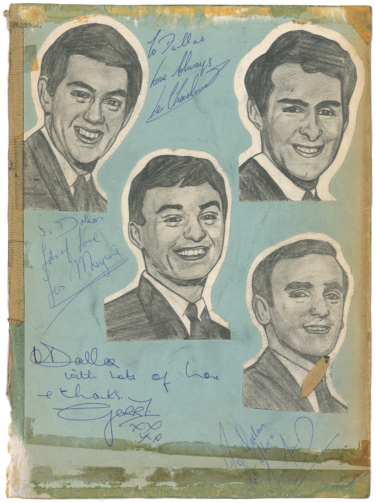 Original vintage Rock and Roll scrapbook, assembled by an adoring young woman named Dallas, on both sides of 17 loose 8.5 x 11.5 heavy stock sheets. Each sheet bears original pencil sketches of popular acts of the time, presumably done by Dallas, with many signed by the respective musician, with many inscribing to Dallas. Signers include: all four members of Gerry and the Pacemakers, Gerry Marsden, Dave Clark, Bobby Vee, all four members of the Escorts, Adam Faith, Freddie, Tommy Quickly, Johnny Kidd, Frank Sinatra, Jr., Brian Pool, Pilla Black, three members of the Hollies, four members of the Shadows, Mark Wynter, the Everly Brothers, Bobby Rydell, all five members of the Mojos, Gene Pitney, the Swinging Blue Jeans, Tony Meehan, Dusty Springfield, and the Searchers. Also included are five signed photos of the Love Affair, as well as several unsigned photos of the young lady posing with various bands. In very good condition, with scattered toning, and tape and adhesive remnants throughout. RRAuction COA.
