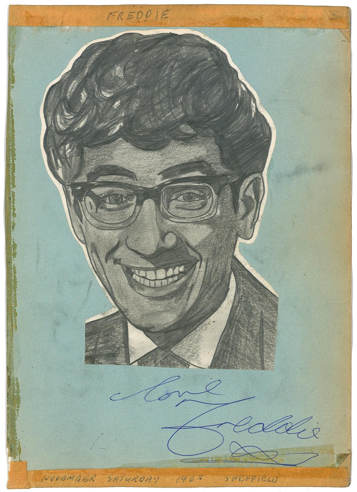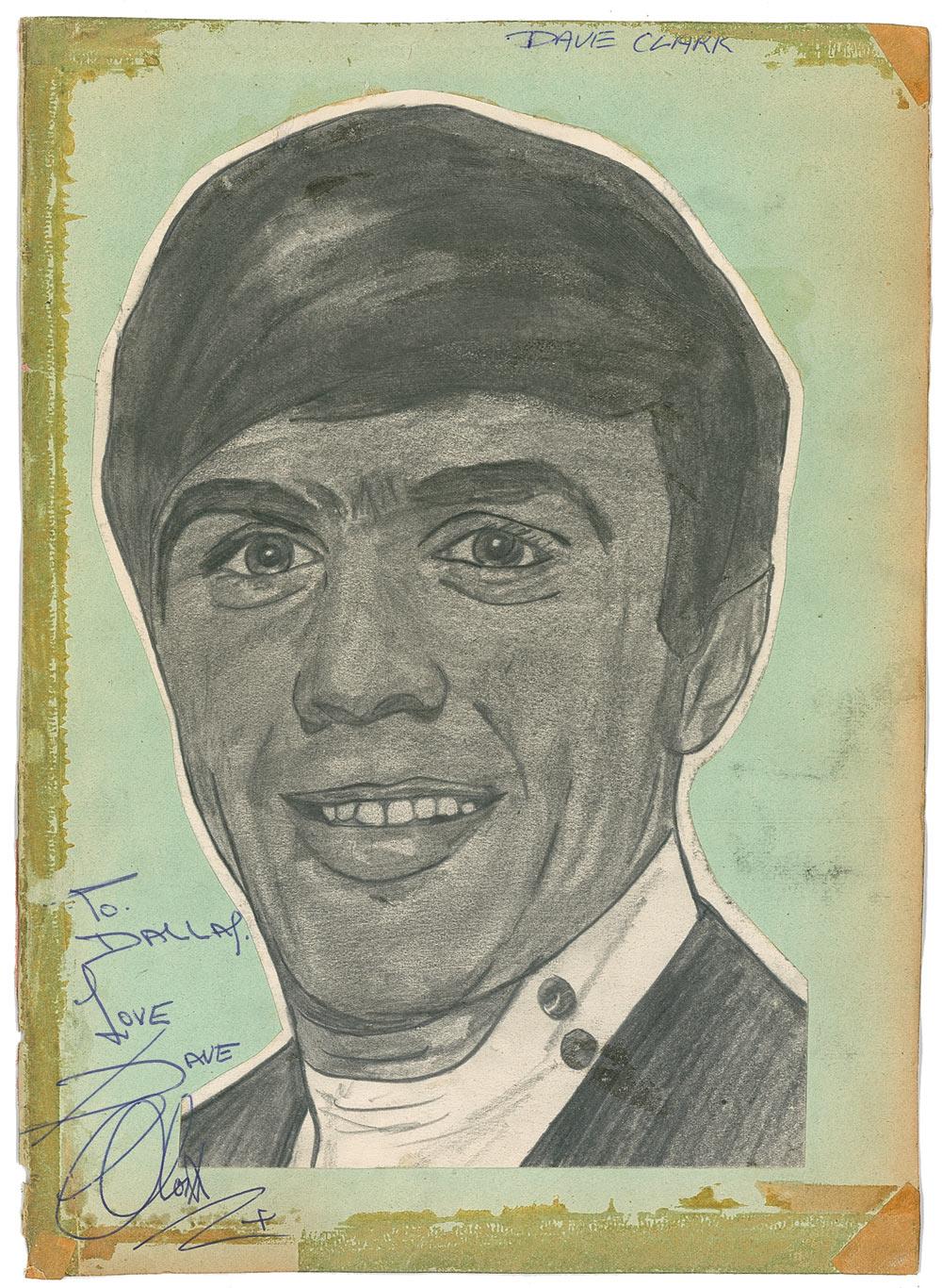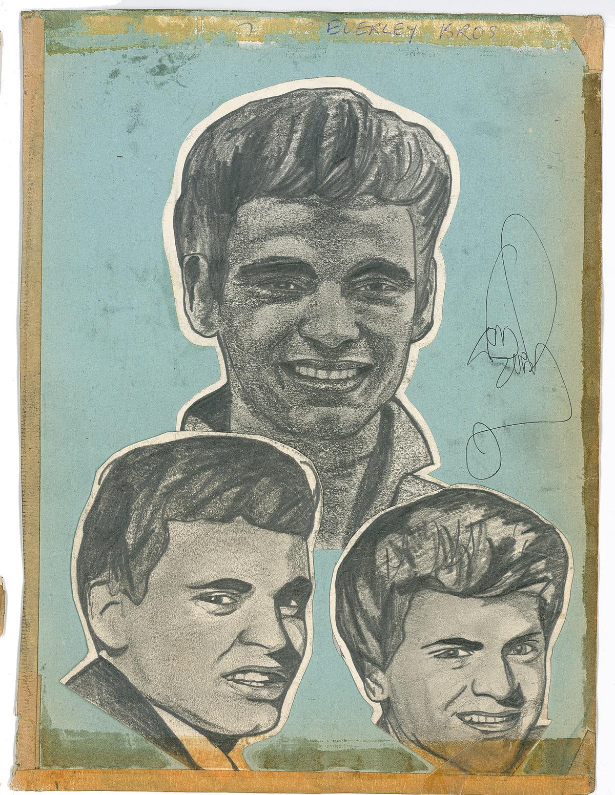 Original vintage Rock and Roll scrapbook, assembled by an adoring young woman named Dallas, on both sides of 17 loose 8.5 x 11.5 heavy stock sheets. Each sheet bears original pencil sketches of popular acts of the time, presumably done by Dallas, with many signed by the respective musician, with many inscribing to Dallas. Signers include: all four members of Gerry and the Pacemakers, Gerry Marsden, Dave Clark, Bobby Vee, all four members of the Escorts, Adam Faith, Freddie, Tommy Quickly, Johnny Kidd, Frank Sinatra, Jr., Brian Pool, Pilla Black, three members of the Hollies, four members of the Shadows, Mark Wynter, the Everly Brothers, Bobby Rydell, all five members of the Mojos, Gene Pitney, the Swinging Blue Jeans, Tony Meehan, Dusty Springfield, and the Searchers. Also included are five signed photos of the Love Affair, as well as several unsigned photos of the young lady posing with various bands. In very good condition, with scattered toning, and tape and adhesive remnants throughout. RRAuction COA.