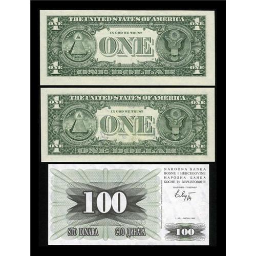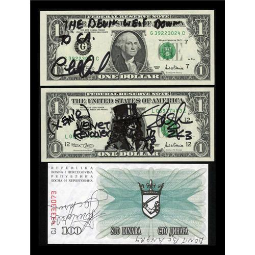 <B>Rock and Roll Autographs, etc.</B></I><BR> These $1 FRNs are autographed by Slash of <I>Guns N Roses </B></I>(with Washington turned into a self portrait,) Charlie Daniels, and Stonewall Jackson (the country singer) on a Bosnia and Herzegovina note. <B>Gem Crisp Uncirculated.</B></I><BR><BR><b>Shipping:</b> Coins & Currency (<a target="_blank" href="http://www.heritageauctions.com/common/shipping.php">view shipping information</a>)