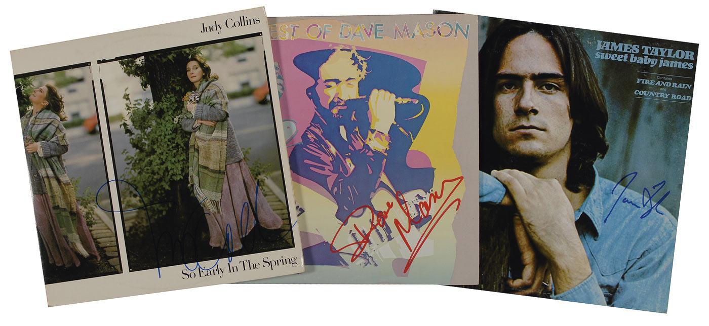 Three signed albums, each signed in ink or felt tip by their respective musician(s). Signers are: Judy Collins (So Early in the Spring), James Taylor (Sweet Baby James), and Dave Mason (The Best of Dave Mason). In fine overall condition.