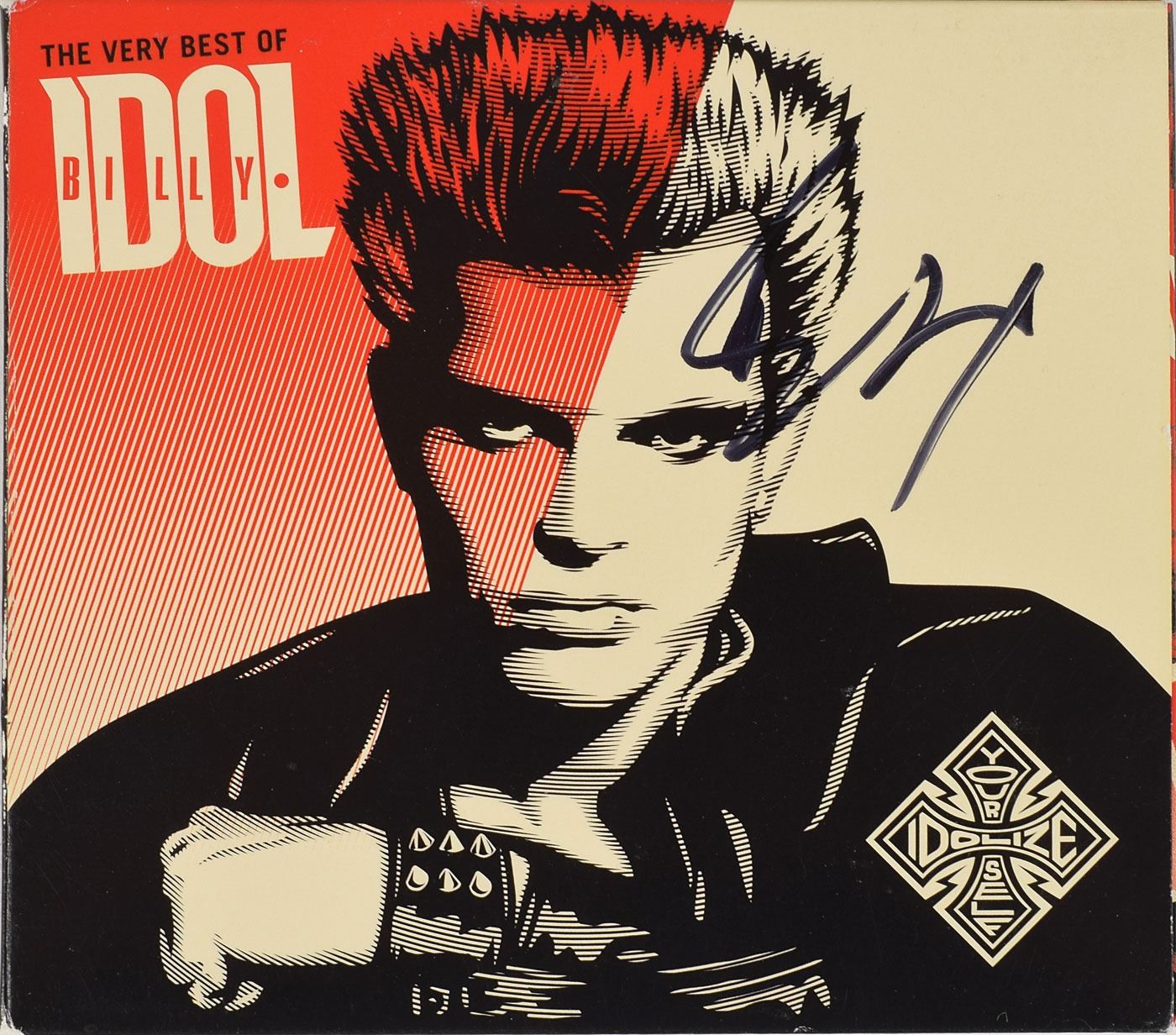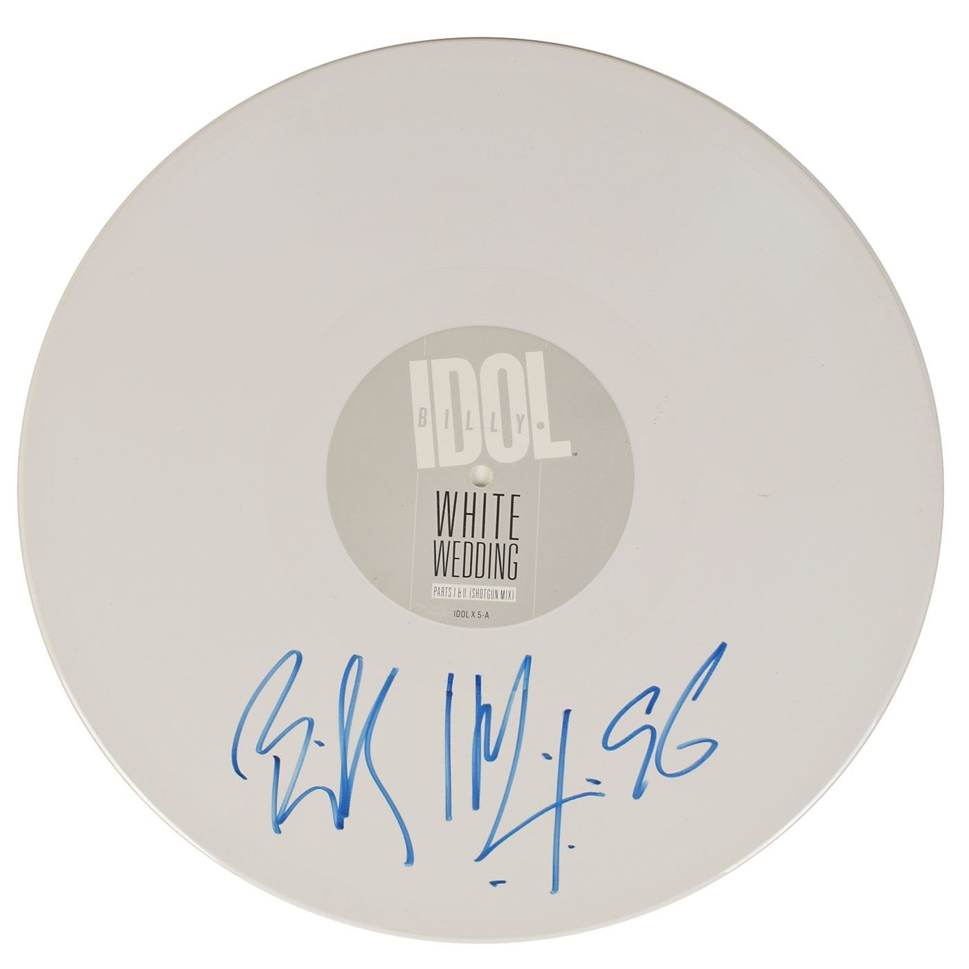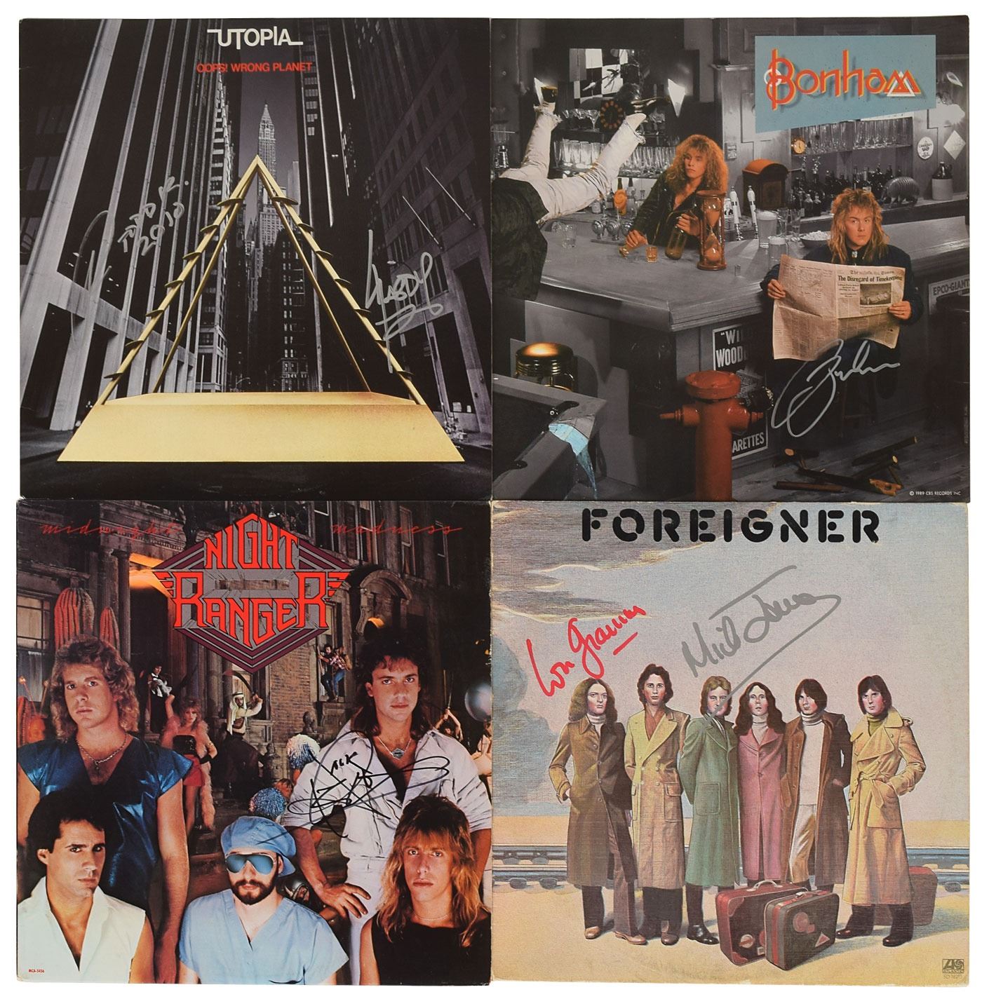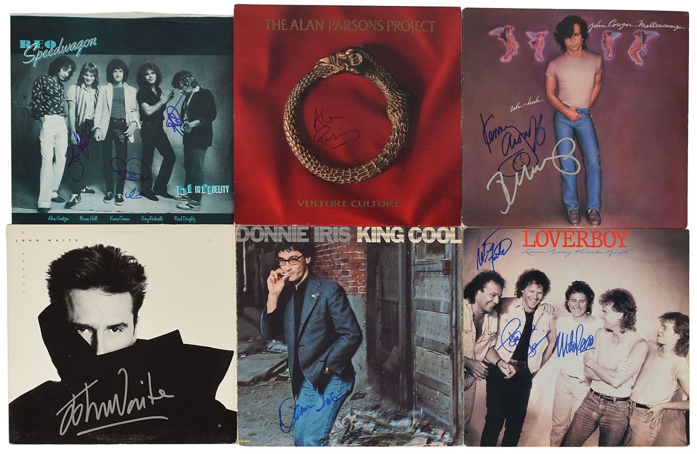 Grouping of twelve items signed by various rock stars, including: a ‘White Wedding’ single record for “Parts I & II (Shotgun Mix),” signed on the disc in blue felt tip by Billy Idol, who adds “96”; The Very Best of Billy Idol CD, signed on the front cover in black felt tip by Idol; the self-titled debut album from Foreigner, signed on the front cover in silver ink by Mick Jones and in red paint pen by Lou Gramm; Uh-huh album signed in silver ink by John Cougar Mellencamp and in blue felt tip by Kenny Aronoff; Vulture Culture album signed on the front cover in blue felt tip by Alan Parsons; Oops! Wrong Planet album from Utopia, signed on the front cover in silver ink by Todd Rundgren and Kasim Sulton; No Brakes album signed on the front cover in silver ink by John Waite; Lovin’ Every Minute of It album from Loverboy, signed on the front cover in blue felt tip by Mike Reno, Paul Dean, and Matt Frenette; King Cool album signed on the front cover in blue felt tip by Donnie Iris; Midnight Madness album from Night Ranger, signed in black felt tip by Jack Blades; an album insert for REO Speedwagon’s Hi Infidelity, signed in blue felt tip by Bruce Hall, Kevin Cronin, and Neal Doughty; and an album flat for The Disregard of Timekeeping from Bonham, signed on the front by Jason Bonham. In overall fine condition. Includes the Idol CDs and all of the records for the albums, not including the insert or flat.