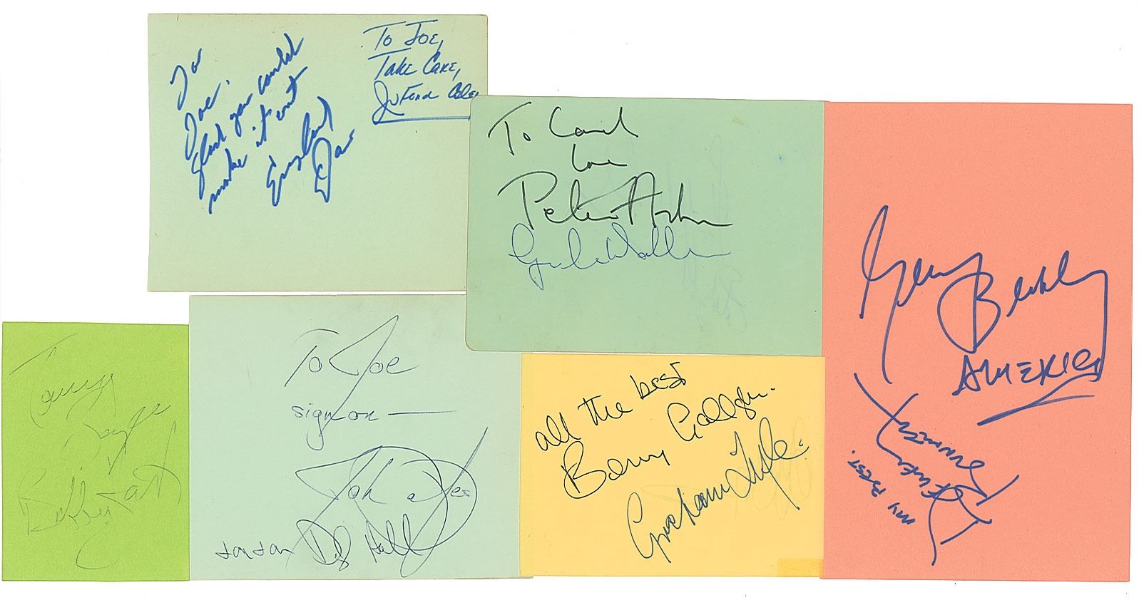 Grouping of six album pages or sheets, ranging in size from 3 x 4 to 4.75 x 7.5, each signed in ink or felt tip by a famous rock and roll duo, including: Hall and Oates (ins); Peter and Gordon (ins); England Dan and John Ford Coley (ins); Boyce and Hart; Gallagher and Lyle; and Gerry Beckley and Dewey Bunnell of America. In overall fine condition.