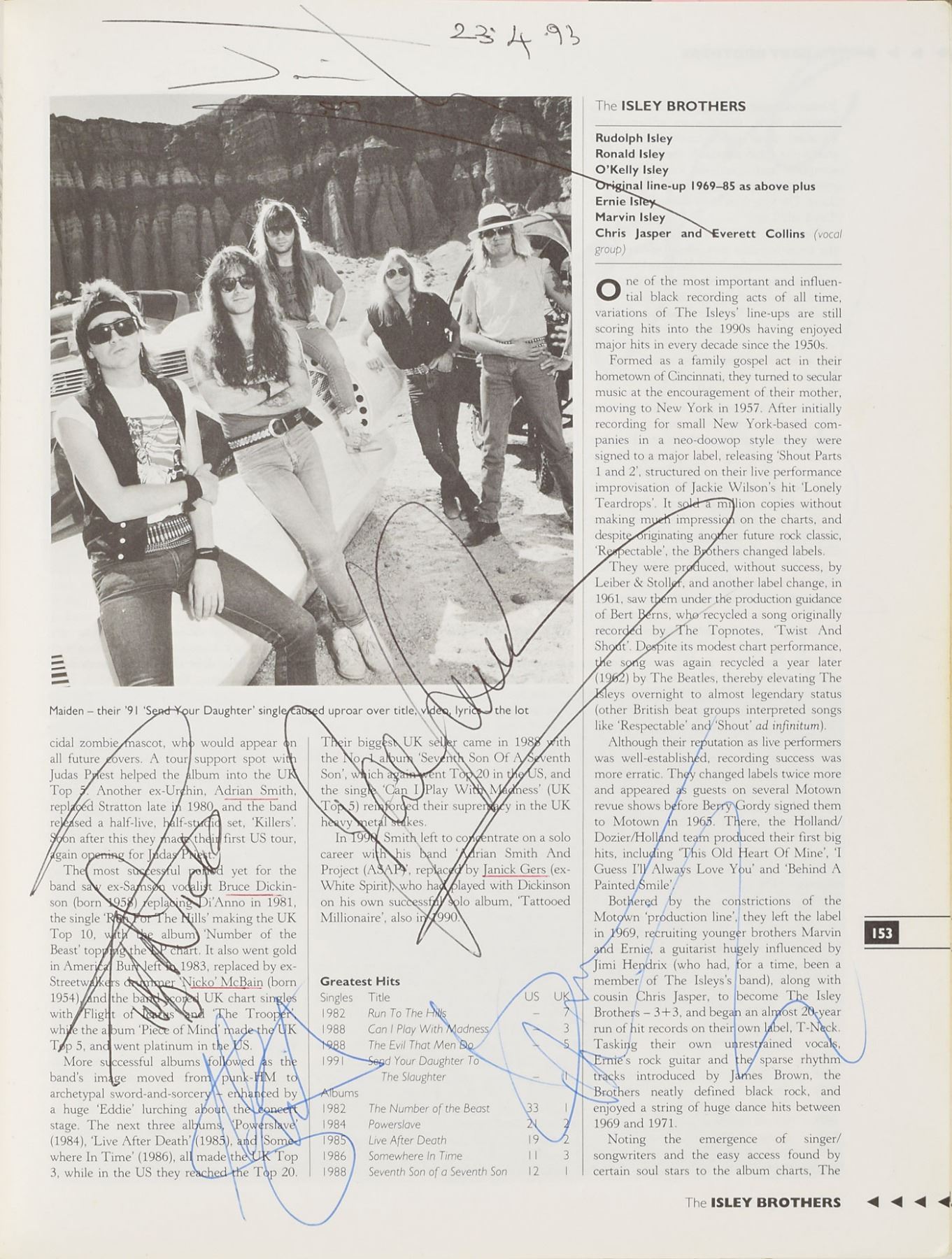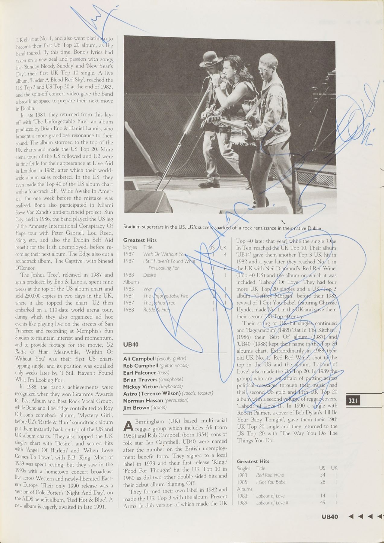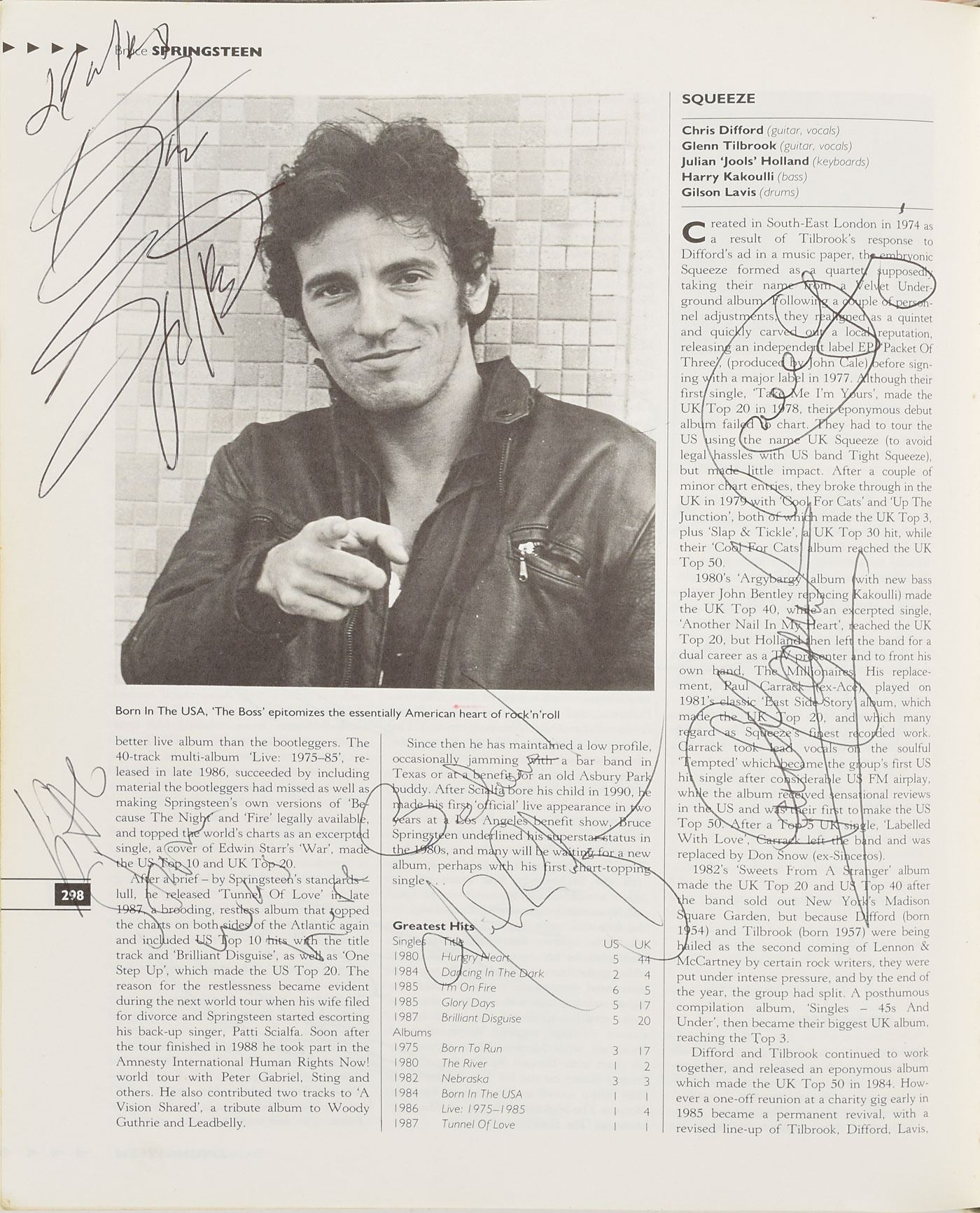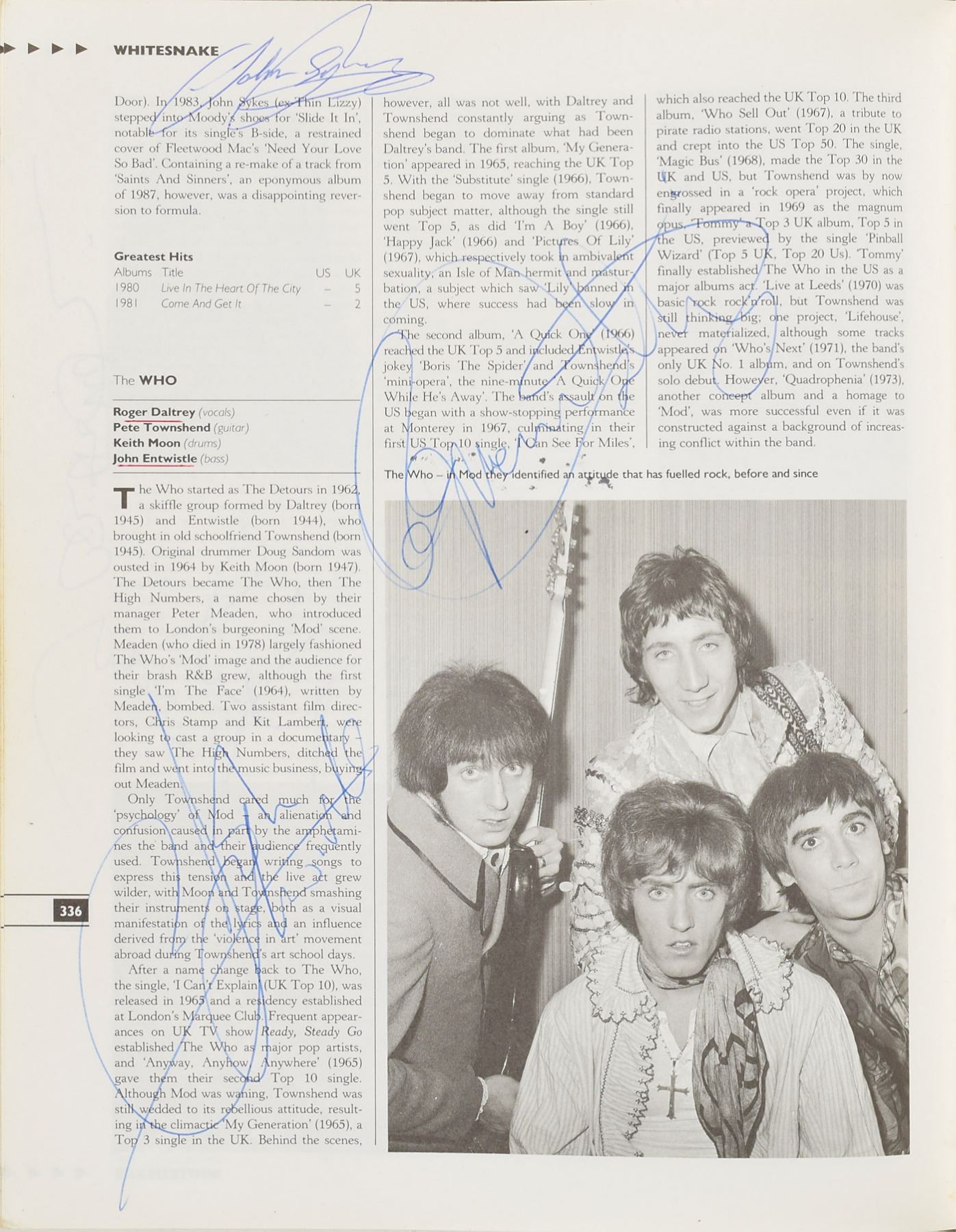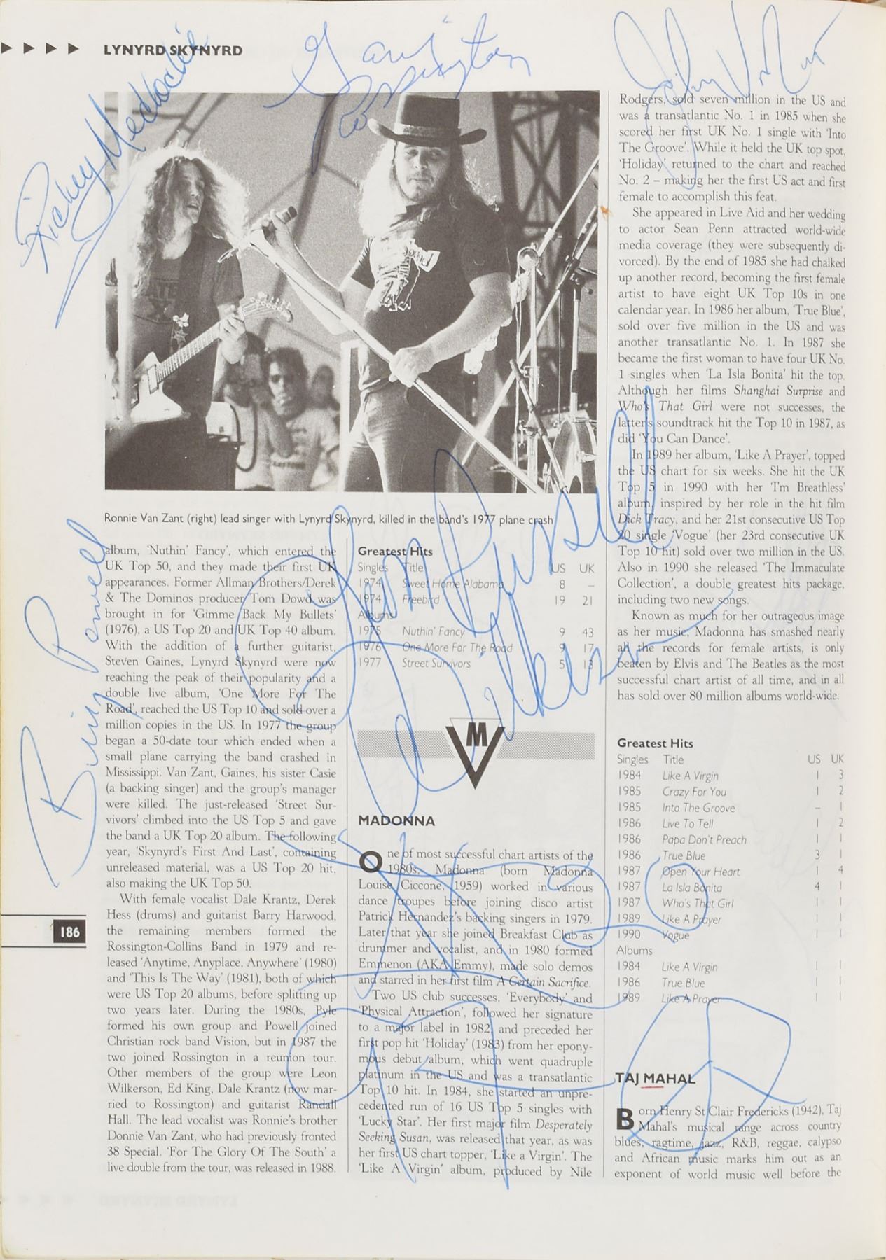 Incredible multi-signed book: Who’s Who in Rock & Roll. First edition. London: Hamlyn Publishing, 1991. Hardcover with dust jacket, 9.5 x 11.5, 350 pages. Signed inside in ballpoint and felt tip by hundreds of legendary solo acts and musical groups (in varying forms of completeness), with some inscribed to “Ove." Highlights include: ABBA, AC/DC, Aerosmith, The Beach Boys, Paul McCartney, Ringo Starr, Chuck Berry, Black Sabbath, Blind Faith, David Bowie, James Brown, The Byrds, Johnny Cash, Chicago, Eric Clapton, Joe Cocker, Leonard Cohen, Alice Cooper, Cream, Creedence Clearwater Revival, CSNY, Deep Purple, Def Leppard, John Denver, Depeche Mode, Bo Diddley, Duran Duran, The Eagles, Eurythmics, The Everly Brothers, Roxy Music, Fleetwood Mac, Guns n’ Roses, Heart, Whitney Houston, Iron Maiden, The Jacksons, Elton John, Judas Priest, B. B. King, The Kinks, KISS, Led Zeppelin, Jerry Lee Lewis, Little Richard, The Sex Pistols, Joni Mitchell, The Moody Blues, Van Morrison, Motley Crue, Yoko Ono, Pet Shop Boys, Pink Floyd, Rainbow, R.E.M., The Rolling Stones, Carlos Santana, Simon and Garfunkel, Patti Smith, Bruce Springsteen, Steely Dan, Cat Stevens, Sting, James Taylor, Ike and Tina Turner, U2, Van Halen, Tom Waits, The Who, Stevie Wonder, The Yardbirds, Yes, ZZ Top, and many more. The book is presented with a custom leather-bound cover with affixed photos of musicians taken at the time of signing. The covers of the book show expected moderate to heavy wear, however the inner signed pages are in fine, clean condition.