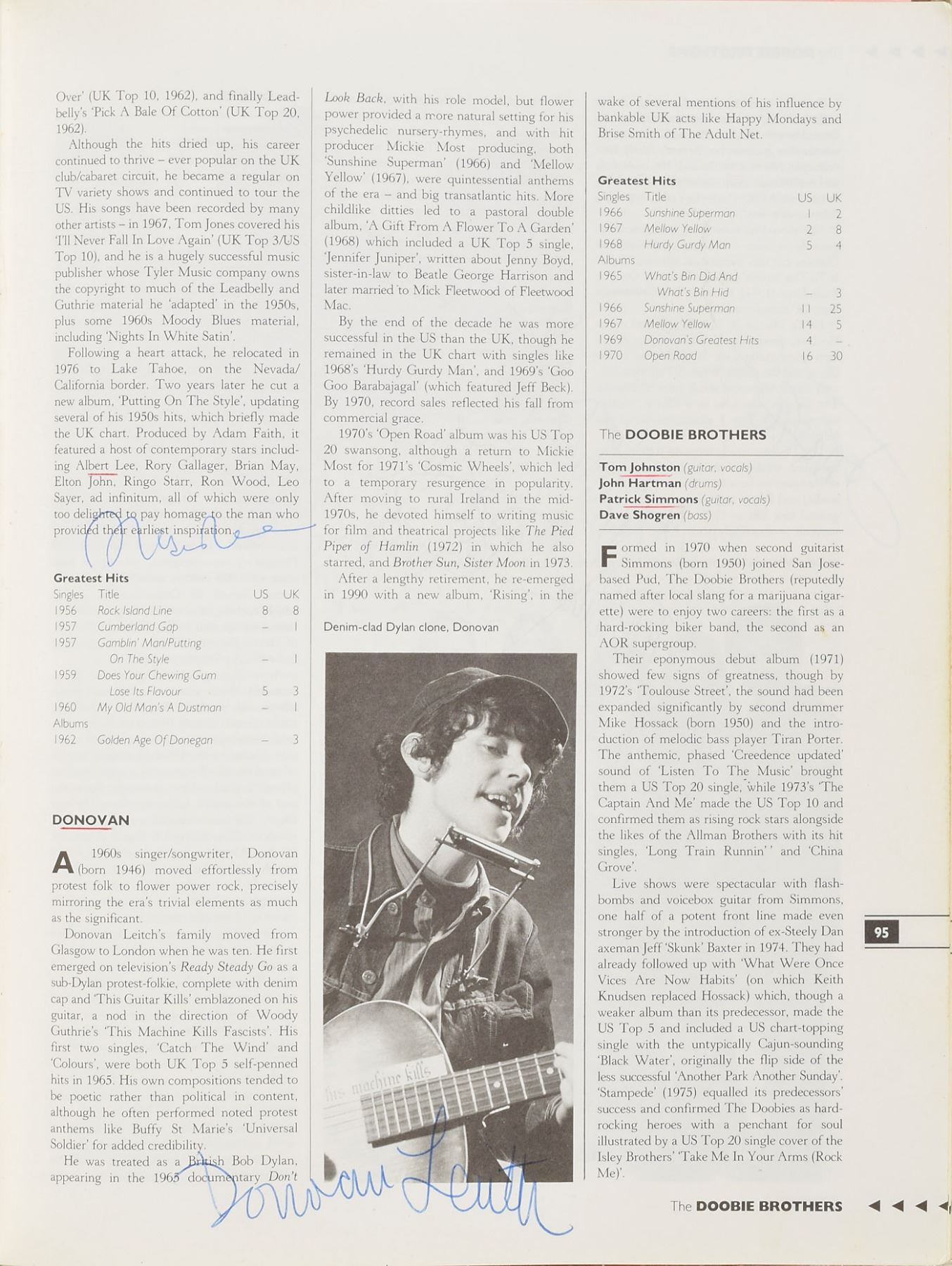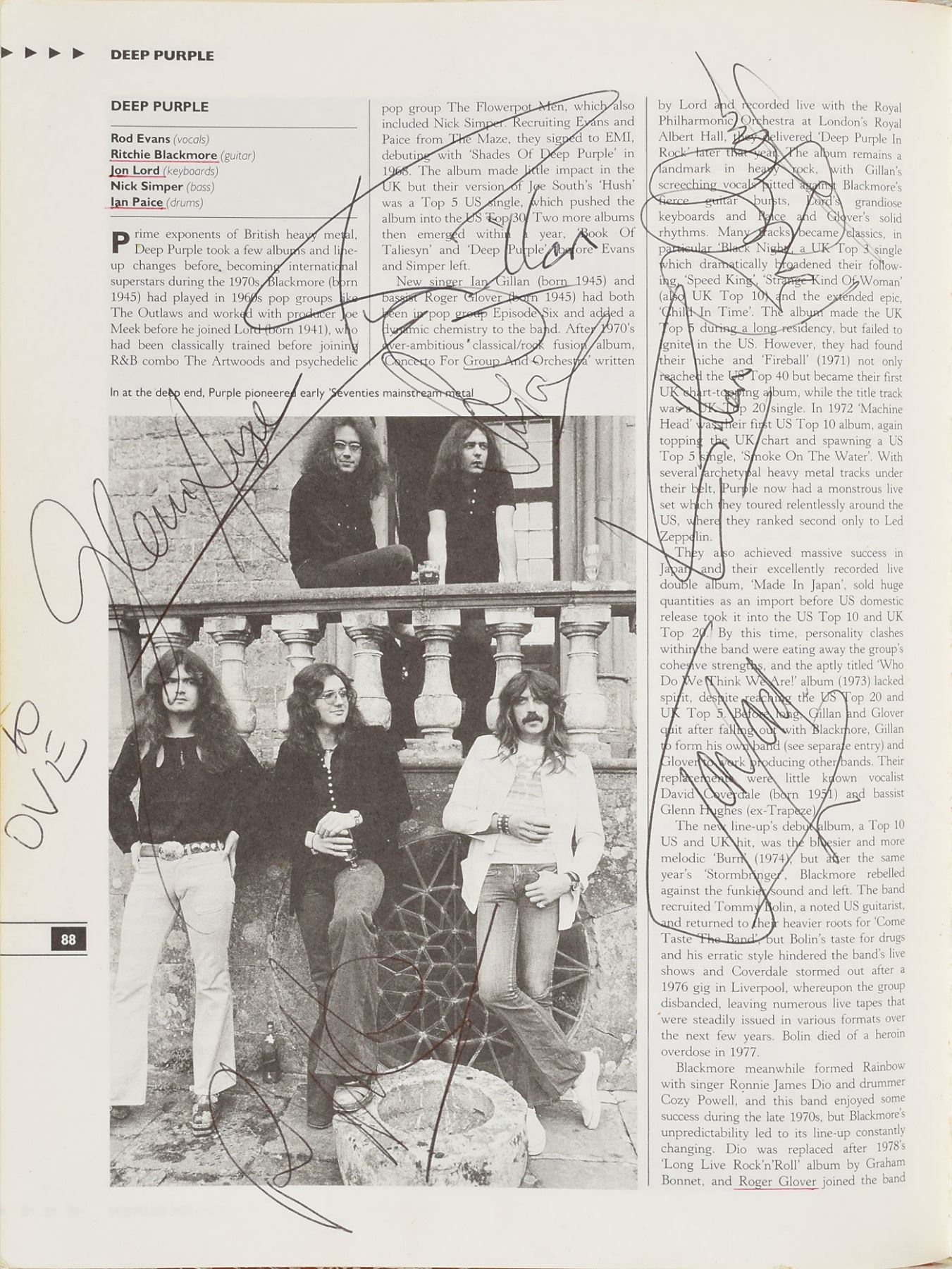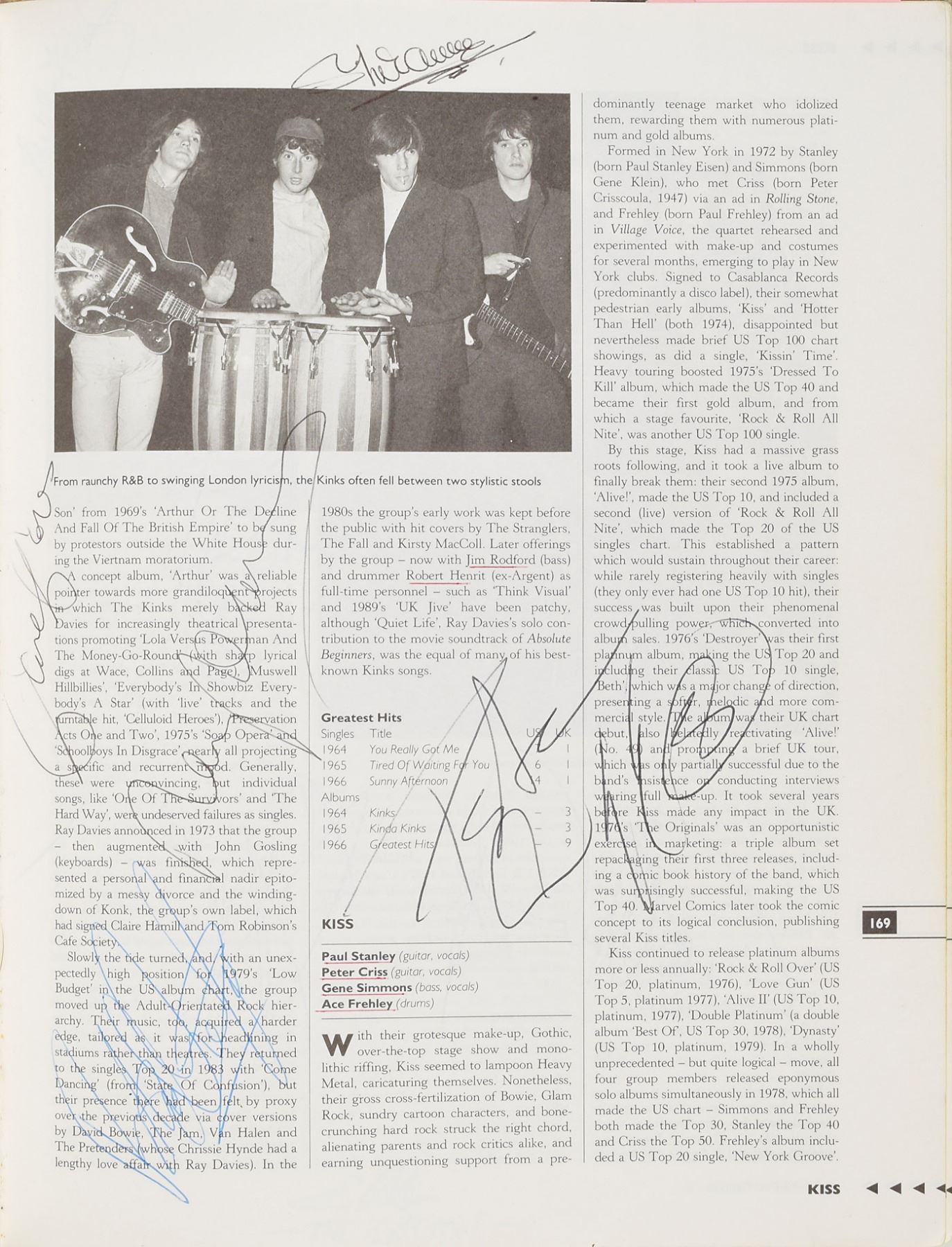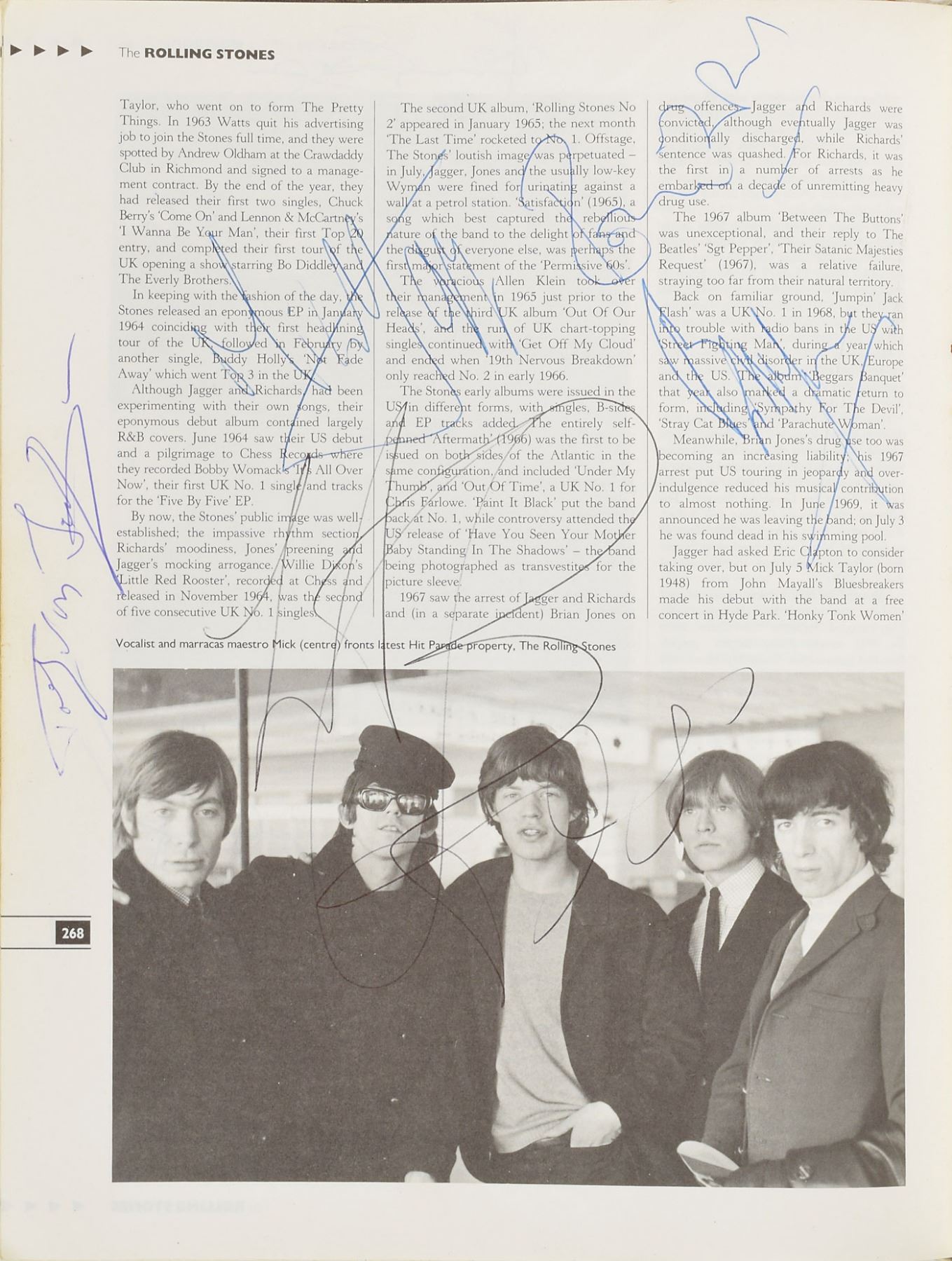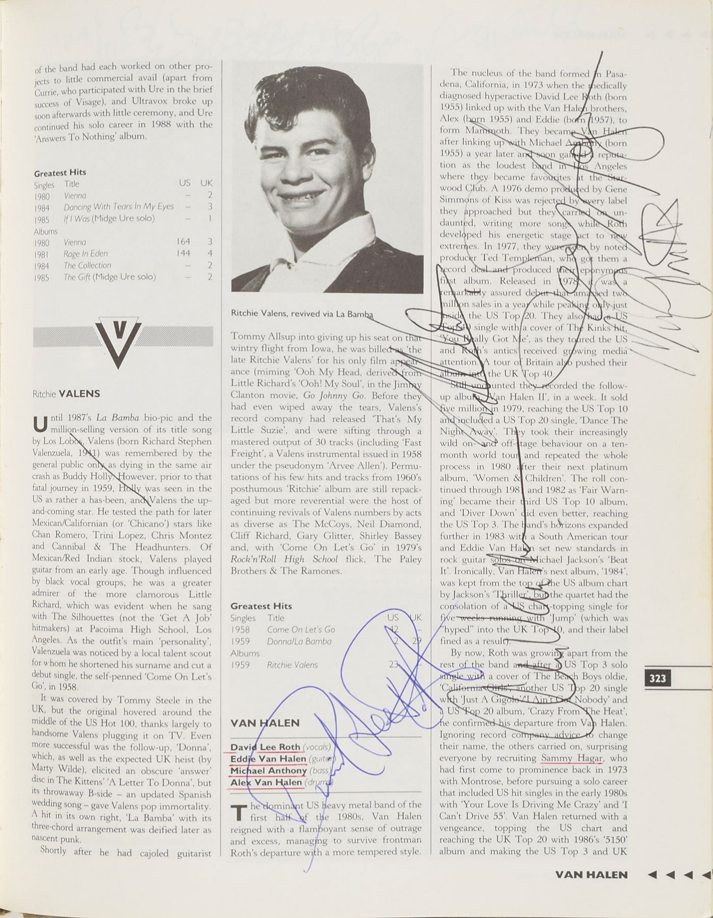 Incredible multi-signed book: Who’s Who in Rock & Roll. First edition. London: Hamlyn Publishing, 1991. Hardcover with dust jacket, 9.5 x 11.5, 350 pages. Signed inside in ballpoint and felt tip by hundreds of legendary solo acts and musical groups (in varying forms of completeness), with some inscribed to “Ove." Highlights include: ABBA, AC/DC, Aerosmith, The Beach Boys, Paul McCartney, Ringo Starr, Chuck Berry, Black Sabbath, Blind Faith, David Bowie, James Brown, The Byrds, Johnny Cash, Chicago, Eric Clapton, Joe Cocker, Leonard Cohen, Alice Cooper, Cream, Creedence Clearwater Revival, CSNY, Deep Purple, Def Leppard, John Denver, Depeche Mode, Bo Diddley, Duran Duran, The Eagles, Eurythmics, The Everly Brothers, Roxy Music, Fleetwood Mac, Guns n’ Roses, Heart, Whitney Houston, Iron Maiden, The Jacksons, Elton John, Judas Priest, B. B. King, The Kinks, KISS, Led Zeppelin, Jerry Lee Lewis, Little Richard, The Sex Pistols, Joni Mitchell, The Moody Blues, Van Morrison, Motley Crue, Yoko Ono, Pet Shop Boys, Pink Floyd, Rainbow, R.E.M., The Rolling Stones, Carlos Santana, Simon and Garfunkel, Patti Smith, Bruce Springsteen, Steely Dan, Cat Stevens, Sting, James Taylor, Ike and Tina Turner, U2, Van Halen, Tom Waits, The Who, Stevie Wonder, The Yardbirds, Yes, ZZ Top, and many more. The book is presented with a custom leather-bound cover with affixed photos of musicians taken at the time of signing. The covers of the book show expected moderate to heavy wear, however the inner signed pages are in fine, clean condition.