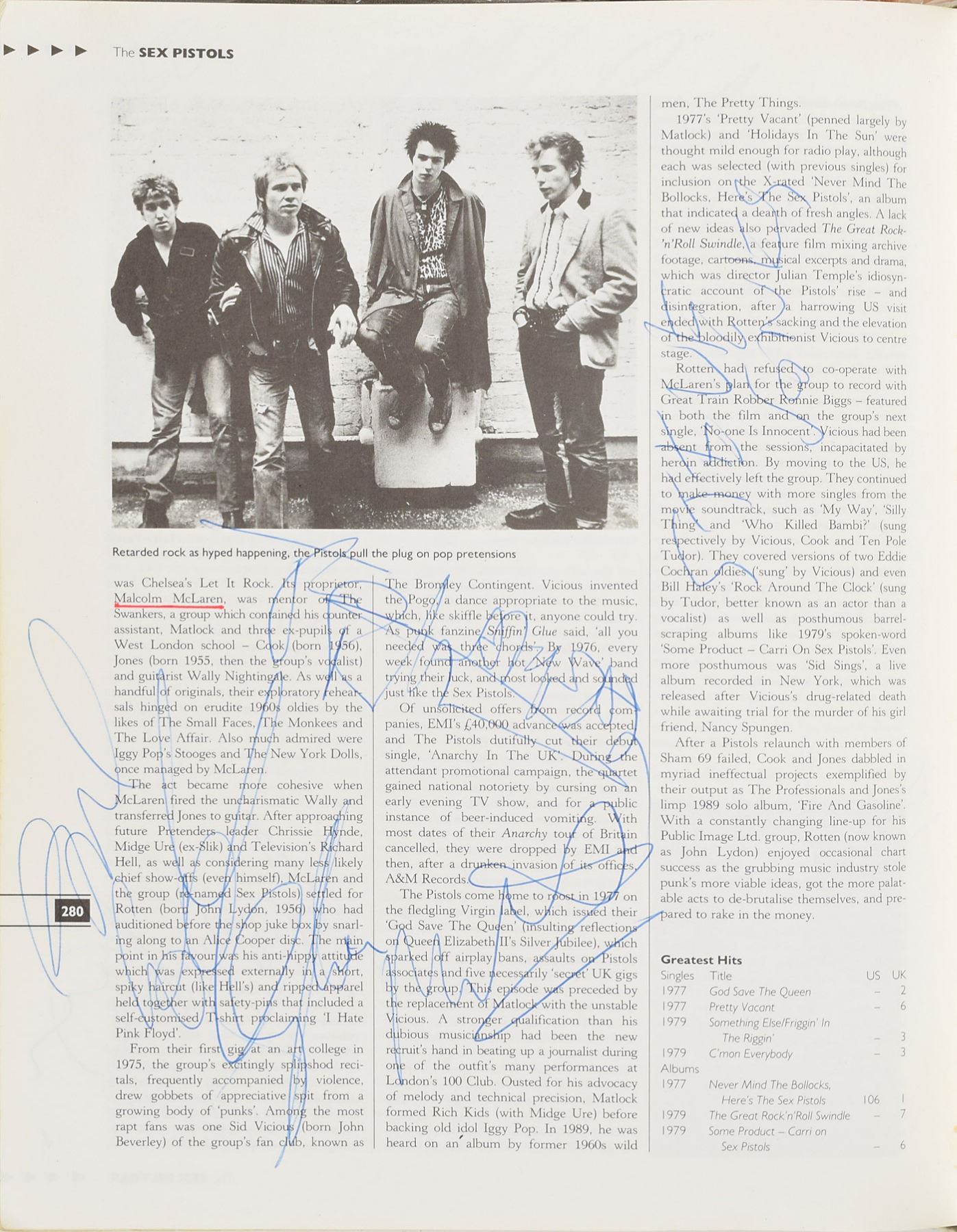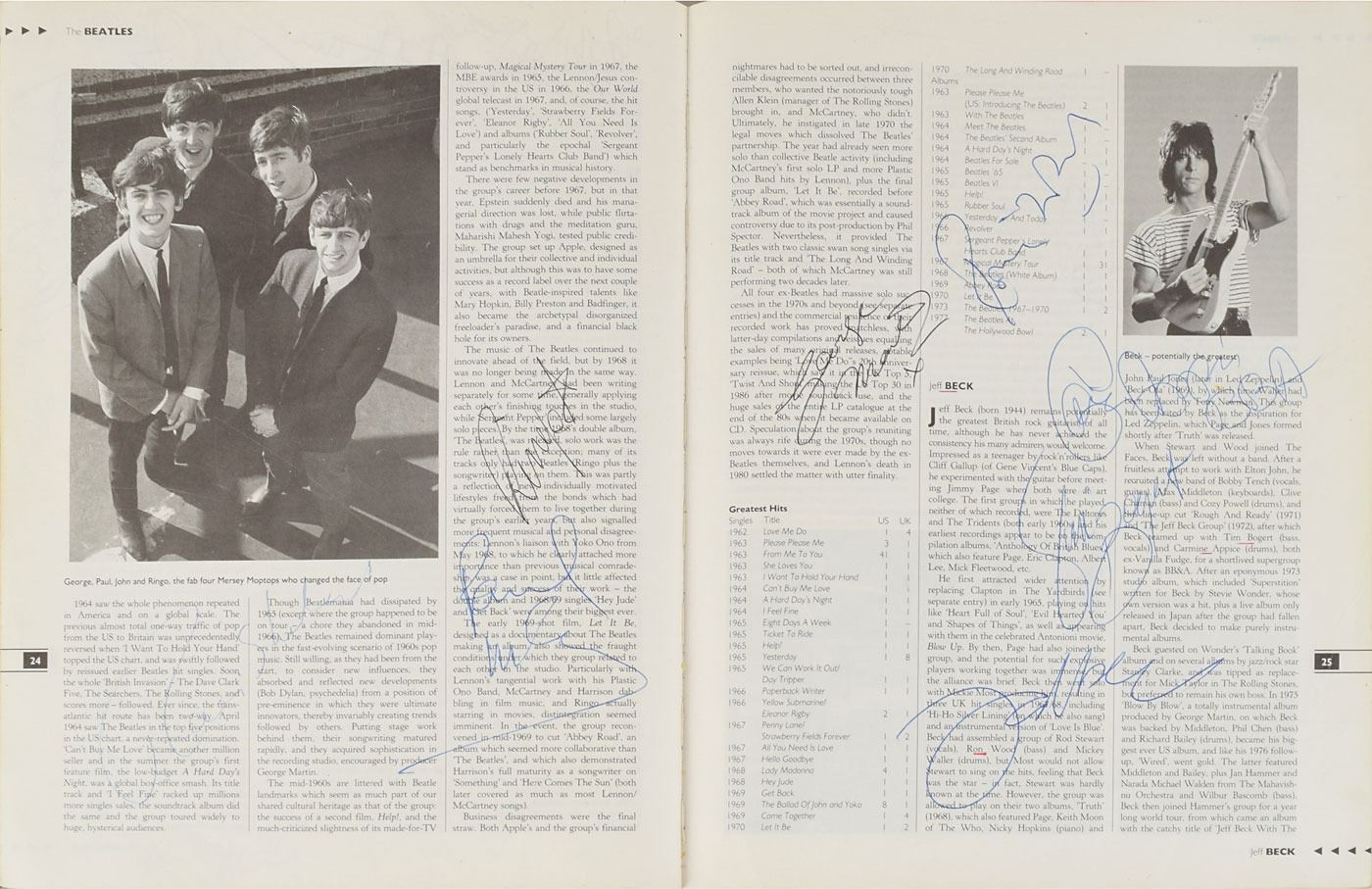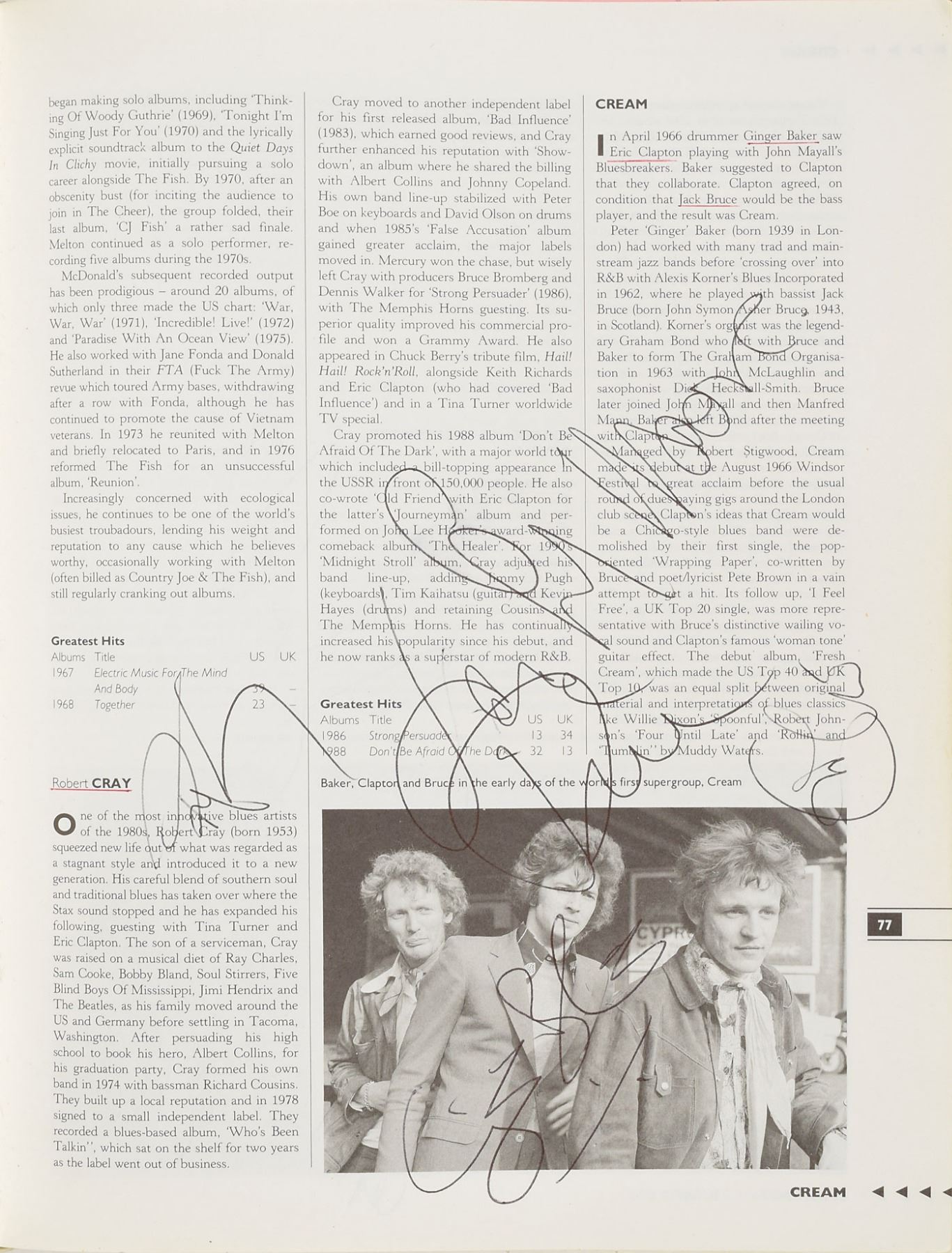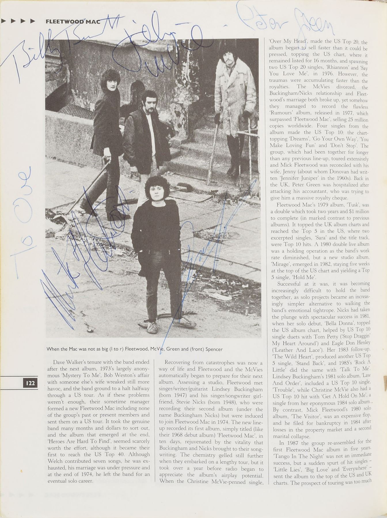Incredible multi-signed book: Who’s Who in Rock & Roll. First edition. London: Hamlyn Publishing, 1991. Hardcover with dust jacket, 9.5 x 11.5, 350 pages. Signed inside in ballpoint and felt tip by hundreds of legendary solo acts and musical groups (in varying forms of completeness), with some inscribed to “Ove." Highlights include: ABBA, AC/DC, Aerosmith, The Beach Boys, Paul McCartney, Ringo Starr, Chuck Berry, Black Sabbath, Blind Faith, David Bowie, James Brown, The Byrds, Johnny Cash, Chicago, Eric Clapton, Joe Cocker, Leonard Cohen, Alice Cooper, Cream, Creedence Clearwater Revival, CSNY, Deep Purple, Def Leppard, John Denver, Depeche Mode, Bo Diddley, Duran Duran, The Eagles, Eurythmics, The Everly Brothers, Roxy Music, Fleetwood Mac, Guns n’ Roses, Heart, Whitney Houston, Iron Maiden, The Jacksons, Elton John, Judas Priest, B. B. King, The Kinks, KISS, Led Zeppelin, Jerry Lee Lewis, Little Richard, The Sex Pistols, Joni Mitchell, The Moody Blues, Van Morrison, Motley Crue, Yoko Ono, Pet Shop Boys, Pink Floyd, Rainbow, R.E.M., The Rolling Stones, Carlos Santana, Simon and Garfunkel, Patti Smith, Bruce Springsteen, Steely Dan, Cat Stevens, Sting, James Taylor, Ike and Tina Turner, U2, Van Halen, Tom Waits, The Who, Stevie Wonder, The Yardbirds, Yes, ZZ Top, and many more. The book is presented with a custom leather-bound cover with affixed photos of musicians taken at the time of signing. The covers of the book show expected moderate to heavy wear, however the inner signed pages are in fine, clean condition.