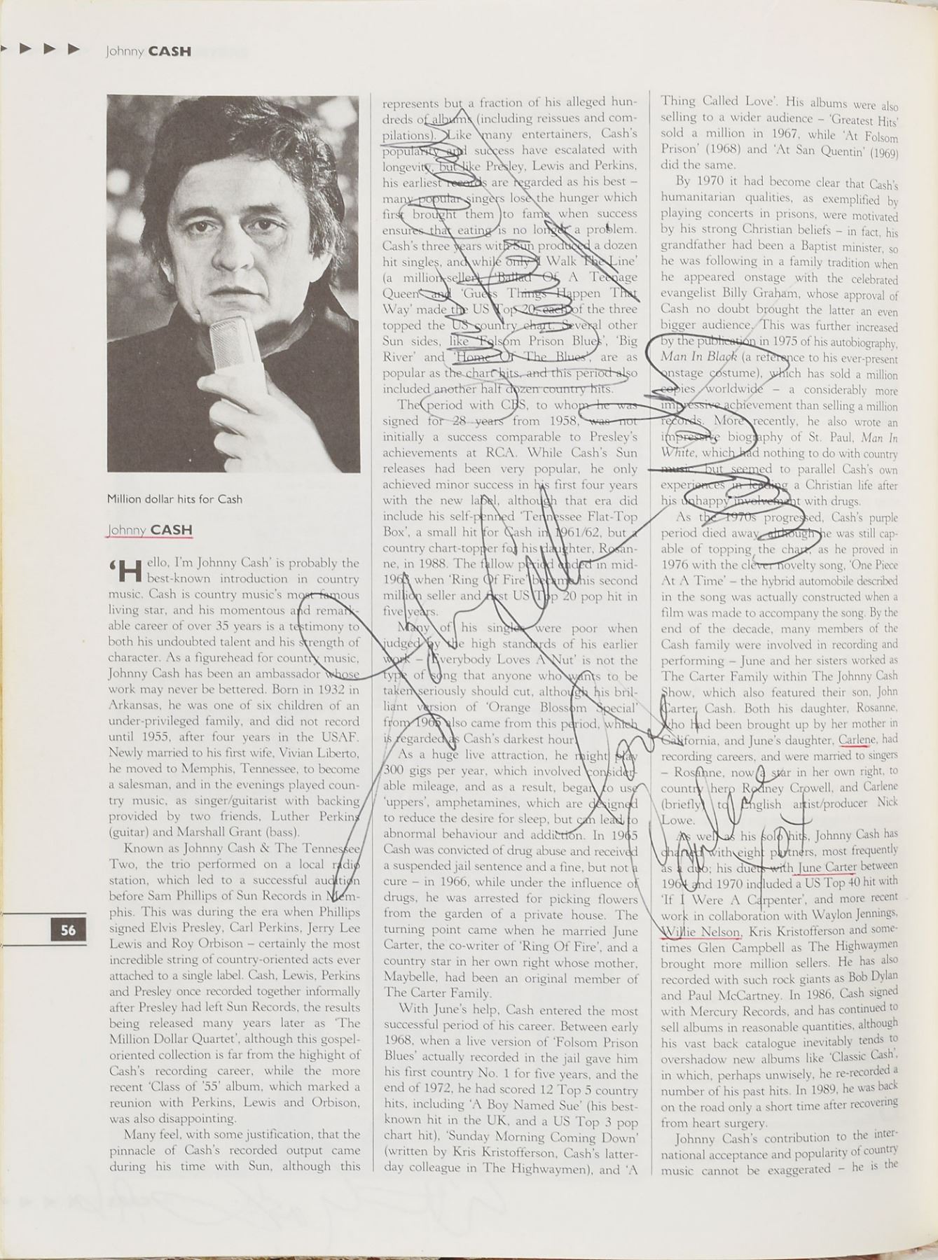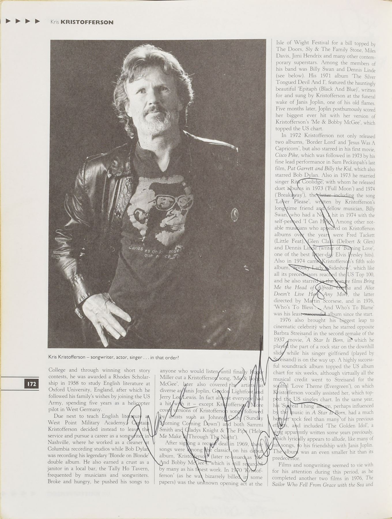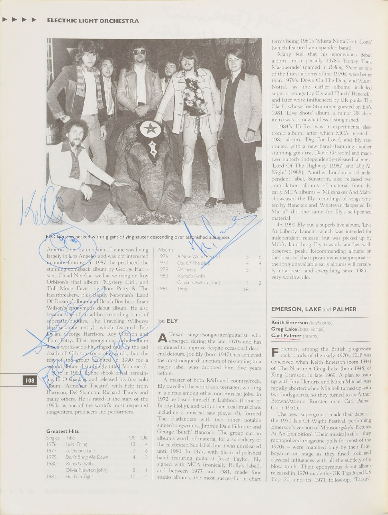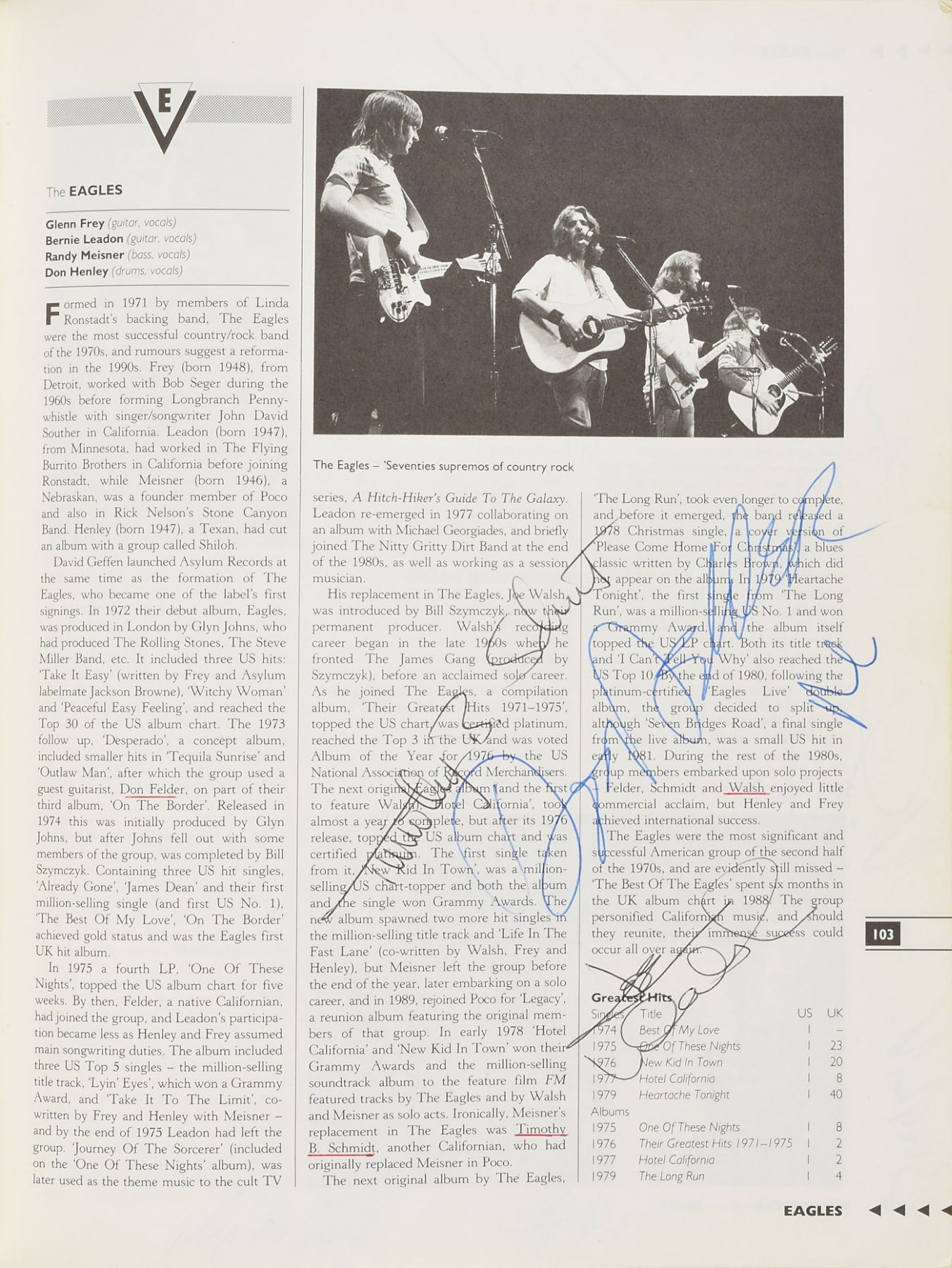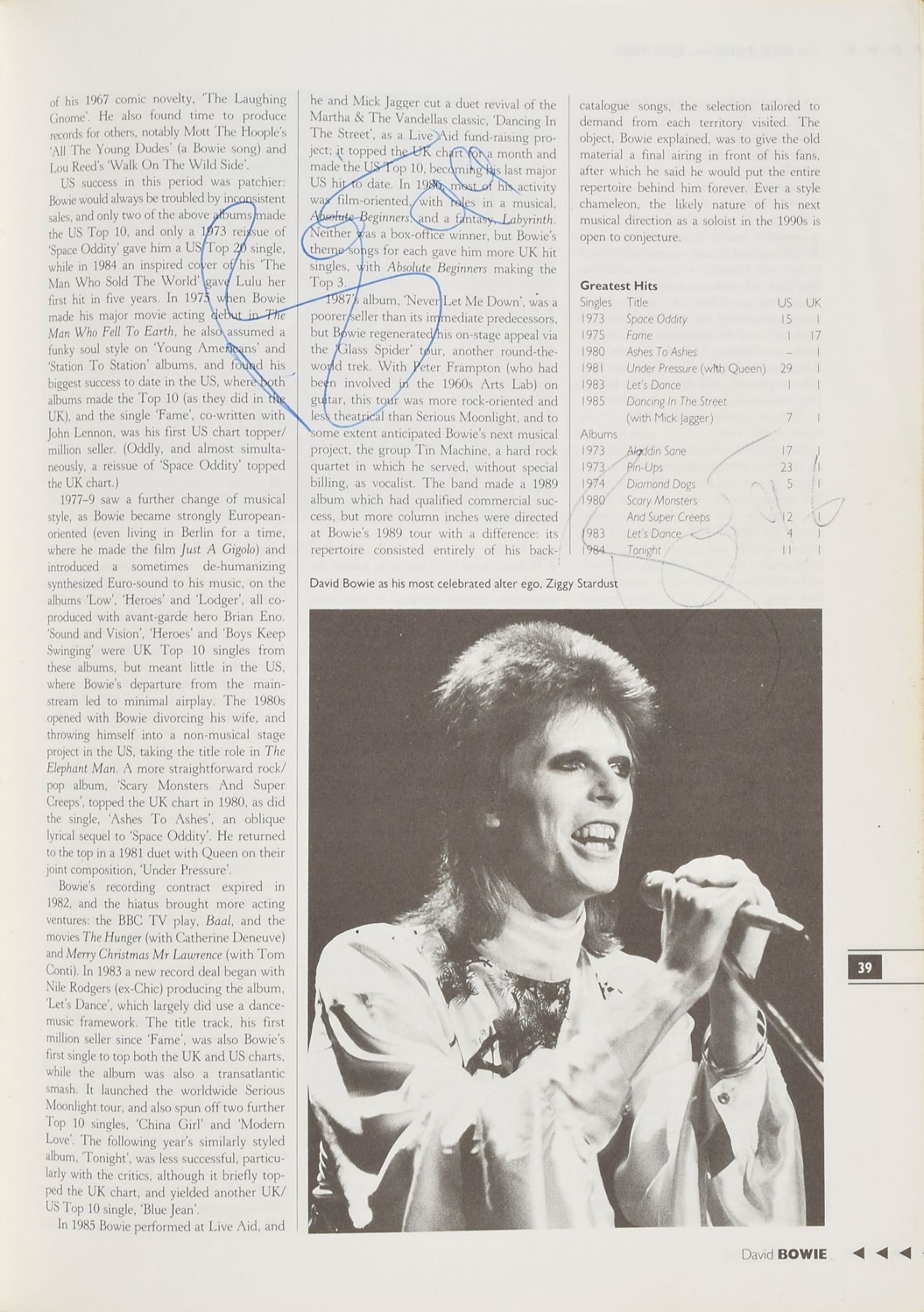 Incredible multi-signed book: Who’s Who in Rock & Roll. First edition. London: Hamlyn Publishing, 1991. Hardcover with dust jacket, 9.5 x 11.5, 350 pages. Signed inside in ballpoint and felt tip by hundreds of legendary solo acts and musical groups (in varying forms of completeness), with some inscribed to “Ove." Highlights include: ABBA, AC/DC, Aerosmith, The Beach Boys, Paul McCartney, Ringo Starr, Chuck Berry, Black Sabbath, Blind Faith, David Bowie, James Brown, The Byrds, Johnny Cash, Chicago, Eric Clapton, Joe Cocker, Leonard Cohen, Alice Cooper, Cream, Creedence Clearwater Revival, CSNY, Deep Purple, Def Leppard, John Denver, Depeche Mode, Bo Diddley, Duran Duran, The Eagles, Eurythmics, The Everly Brothers, Roxy Music, Fleetwood Mac, Guns n’ Roses, Heart, Whitney Houston, Iron Maiden, The Jacksons, Elton John, Judas Priest, B. B. King, The Kinks, KISS, Led Zeppelin, Jerry Lee Lewis, Little Richard, The Sex Pistols, Joni Mitchell, The Moody Blues, Van Morrison, Motley Crue, Yoko Ono, Pet Shop Boys, Pink Floyd, Rainbow, R.E.M., The Rolling Stones, Carlos Santana, Simon and Garfunkel, Patti Smith, Bruce Springsteen, Steely Dan, Cat Stevens, Sting, James Taylor, Ike and Tina Turner, U2, Van Halen, Tom Waits, The Who, Stevie Wonder, The Yardbirds, Yes, ZZ Top, and many more. The book is presented with a custom leather-bound cover with affixed photos of musicians taken at the time of signing. The covers of the book show expected moderate to heavy wear, however the inner signed pages are in fine, clean condition.