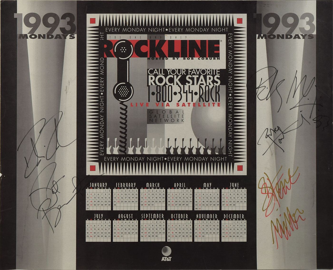 Rockline calendar poster for the year 1993, 26.5 x 21.5, signed in black felt tip by Pete Townshend, Pat Benetar, Billy Idol, Robin Zander, and in gold and red felt tip by Steve Miller, who signs twice. Rolled and in fine condition, with a small chip to the left edge.