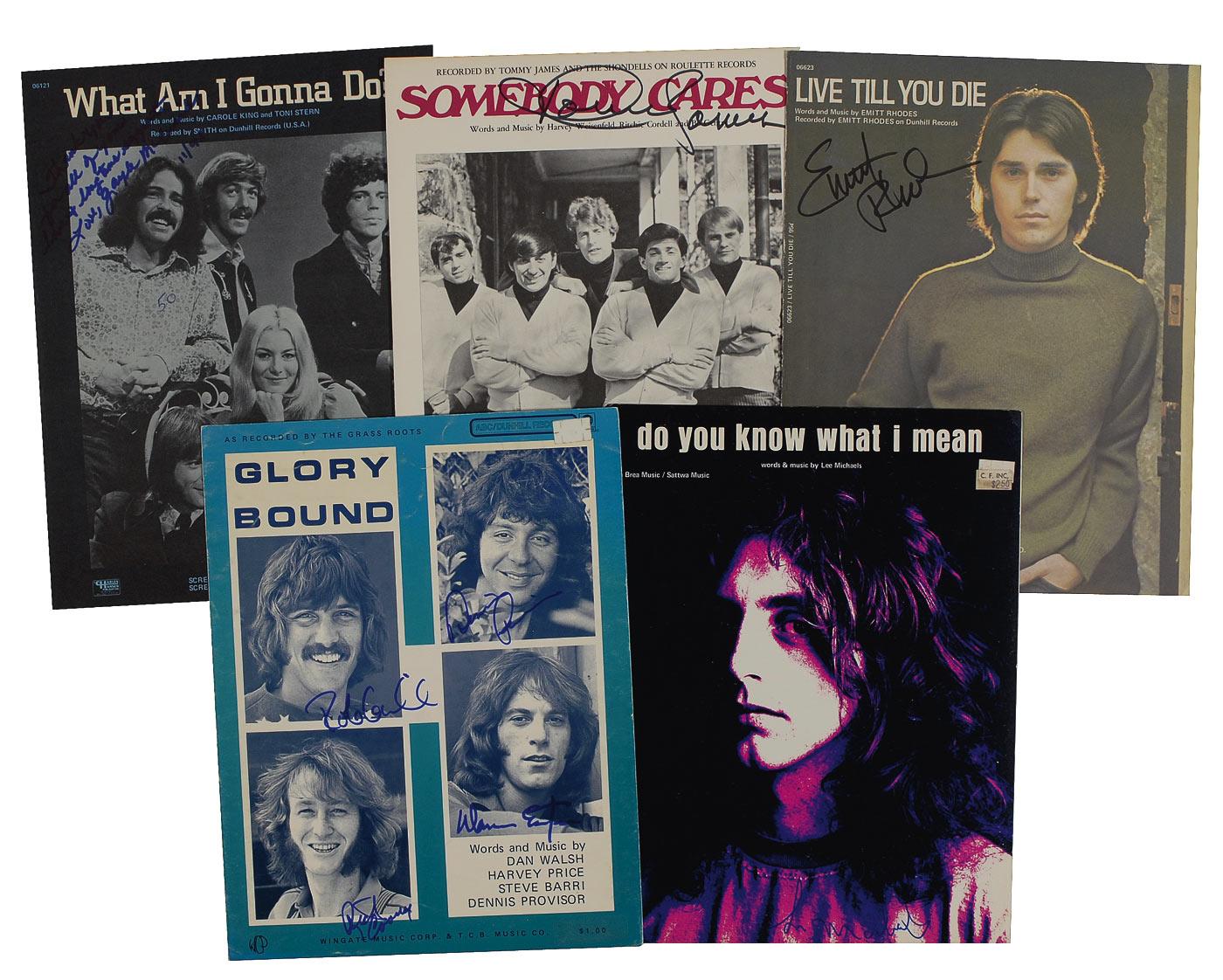 Signed group of 1960s sheet music, each signed on the front in felt tip by the respective musician[s]: Gayle McCormick (Smith), Tommy James, Emitt Rhodes, Lee Michaels, and all four members of the Grass Roots. In fine overall condition.