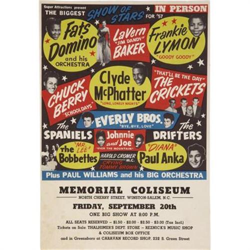 <B>Rock 'n' Roll Show of Stars Memorial Coliseum/Winston-Salem 1957 Handbill (Super Attractions, 1957).</B></I> Rock 'n' Roll shows during the late 1950s were usually multi-artist events, with each act performing three or four numbers, including their big hit of the day. Here's a great example of a handbill for such a show -- and what a show! The headliners included Fats Domino, LaVern Baker, and Frankie Lymon, but the huge list of supporting acts also included Chuck Berry, the Crickets (with Buddy Holly), the Everly Brothers, the Drifters, even Paul Anka! All this and more, for a cover charge of only $1.50 to $3 -- wow! This four-color handbill measures approximately 6.25" x 9", and is in VF condition.<BR><BR><b>Shipping:</b> Flat Material, Small (<a target="_blank" href="http://www.heritageauctions.com/common/shipping.php">view shipping information</a>)