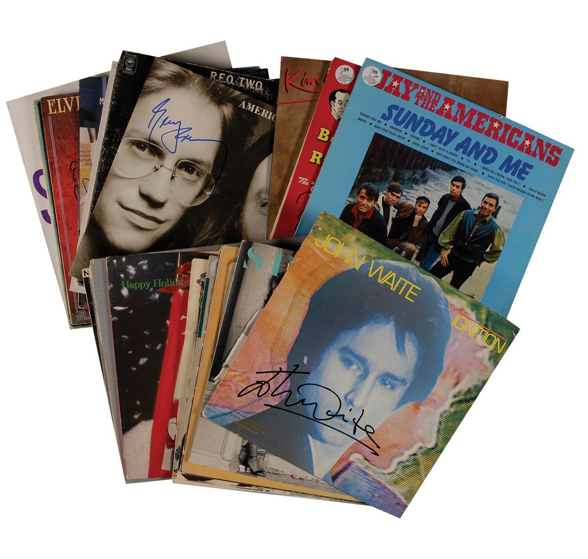 Thirty-five rock and roll albums, each signed on the front in ink or felt tip by the respective artists. Signers are: Jay Black (Jay and the Americans); Mick Box (Uriah Heep); Whispers; Southside Johnny, Peter Noone (Herman’s Hermits), Glenn Tilbrook (Squeeze); Mark Lindsay (Paul Revere and the Raiders); Colin Hay (Men at Work); Marty Balin; Hall & Oates; Dewey Bunnell and Gerry Beckley (America); Kevin Cronin, Neal Doughty, and Bruce Hall (REO Speedwagon); Robert Klein; Martha Davis (The Motels); Johnny Mathis; Paul Rogers and Tony Franklin (The Firm); Elvin Bishop; The Fixx; Steve Winwood; Billy Joel; Glen Campbell; Dick Smothers; Nick Lowe; Jean-Luc Ponty; Roy Clark; Steve Hackett; Wynton Marsalis; Dave Mason; Robby Rydell; Patty Page; Ian Matthews; Sheila E.; John Waite; Rick Springfield; and Kim Carnes. In very good to fine condition, with the expected wear.