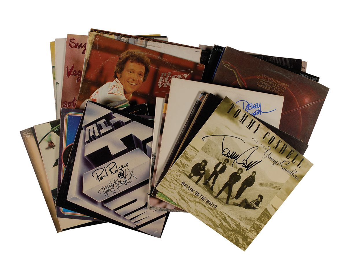 Thirty rock and roll albums, each signed on the front in ink or felt tip by the respective artists. Signers are: Dewey Bunnell and Gerry Beckley (America); Debbie Gibson; Gino Vannelli; Rod Argent; Vinnie Moore; Johnny Mathis; Rita Coolidge; Emmylou Harris; James Taylor; Lou Gramm (Foreigner); Todd Rundgren (Utopia); Nils Lofgren (Grin); Dave Cousins, Dave Lambert, and Chas Cronk (Strawbs); Peter Noone (Herman’s Hermits); Paul Rogers and Tony Franklin (The Firm); Mike Love (Beach Boys); Phil Lewis, Steve Riley, and Tracii Guns (LA Guns); Kevin Cronin, Neal Doughty, and Bruce Hall (REO Speedwagon); Anita Pointer (Pointer Sisters); Pat Boone; Al Stewart; Bobby Vinton; Dave Mason; George Benson; Billy Joel; Tommy Conwell; Crystal Gayle; Toni Tennille (Captain & Tennille); Melanie; and Suzanne Vega. In very good to fine condition, with the expected wear.