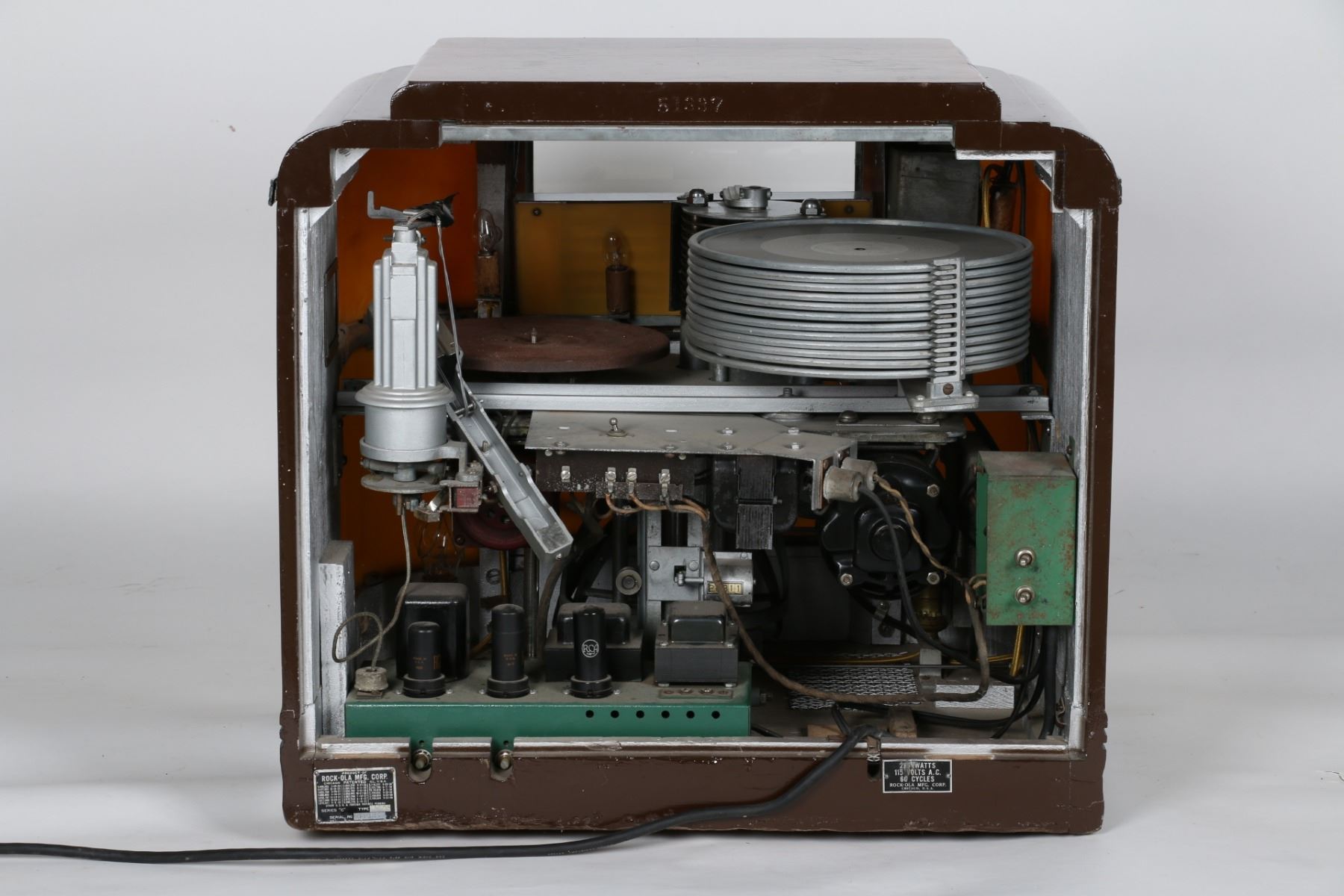 American. Circa 1940. Holds twelve 78rpm records. Series "C", Model M39. Includes Key. 22.5" x 24" x 21" deep. Requires an auxiliary speaker to play. In operational condition. $1200-1500.