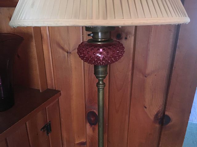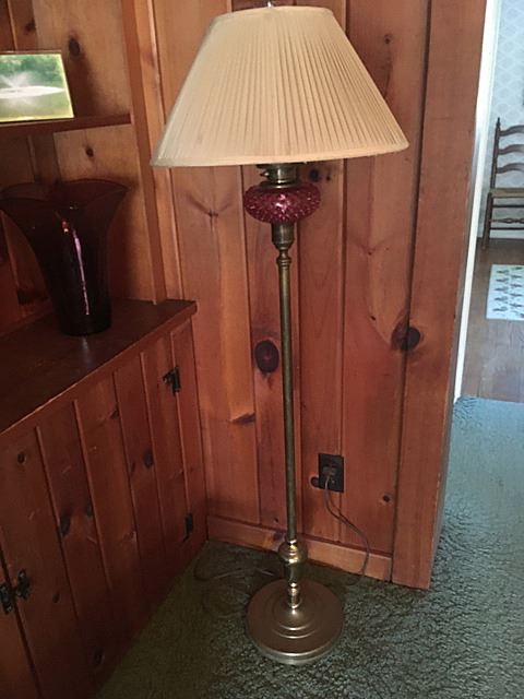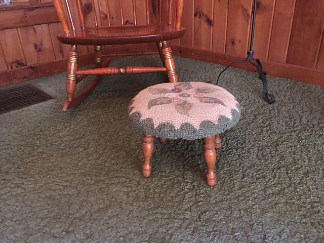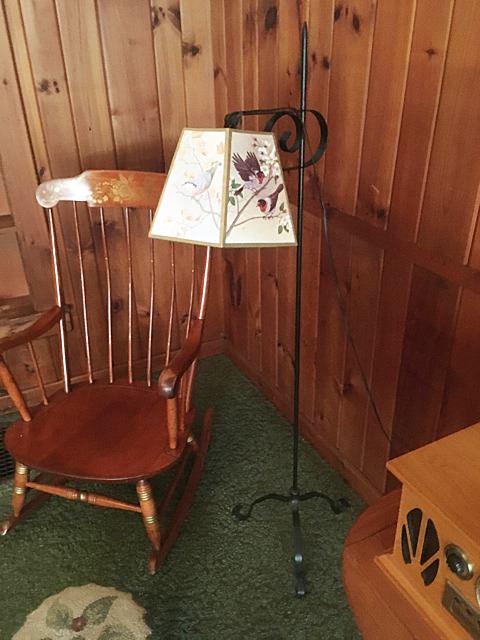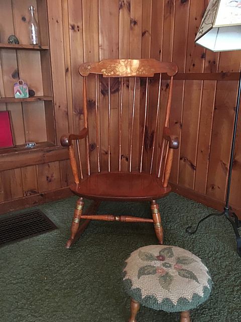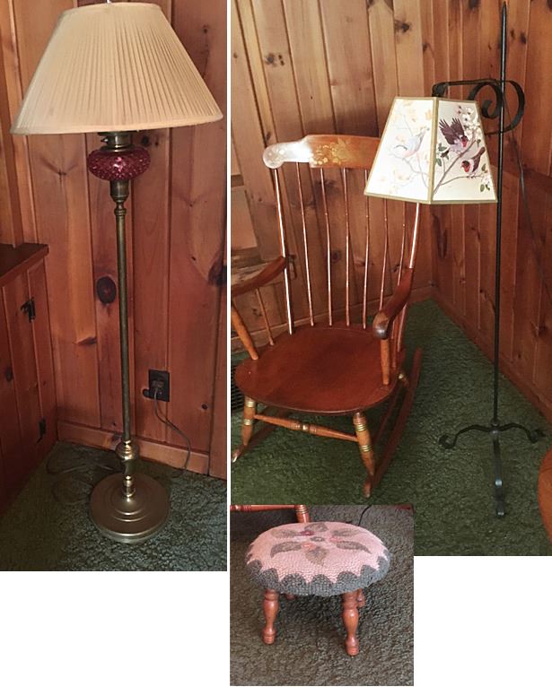 Hitchcock style rocking chair, needlepoint foot stool, wrought iron floor lampt, brass floor lamp with cranberry hobnail glass from the farm.